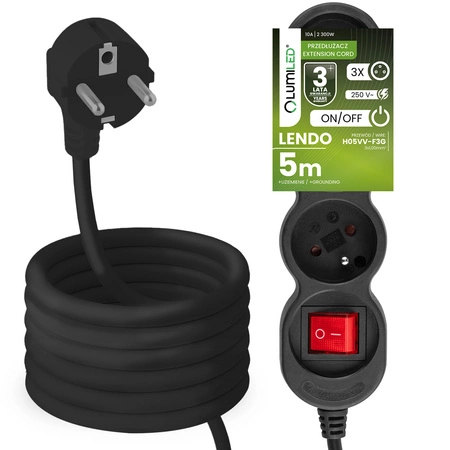 Przedłużacz Sieciowy Kabel z Uziemieniem Listwa Zasilająca 3 Gniazda 5m Włącznik ON/OFF Czarny Sznur Lendo Lumiled - czwarta cecha produktu
