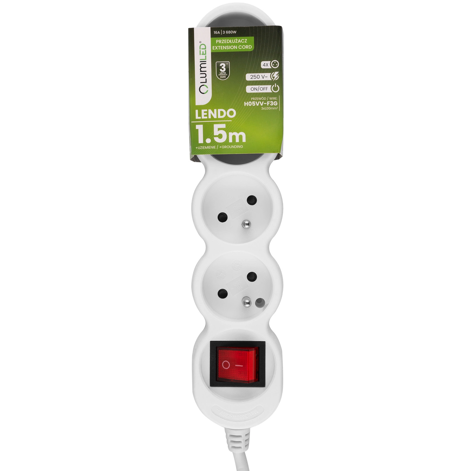 Przedłużacz Sieciowy Kabel z Uziemieniem Listwa Zasilająca 4 Gniazda 1.5m Włącznik ON/OFF Biały Sznur Lendo Lumiled