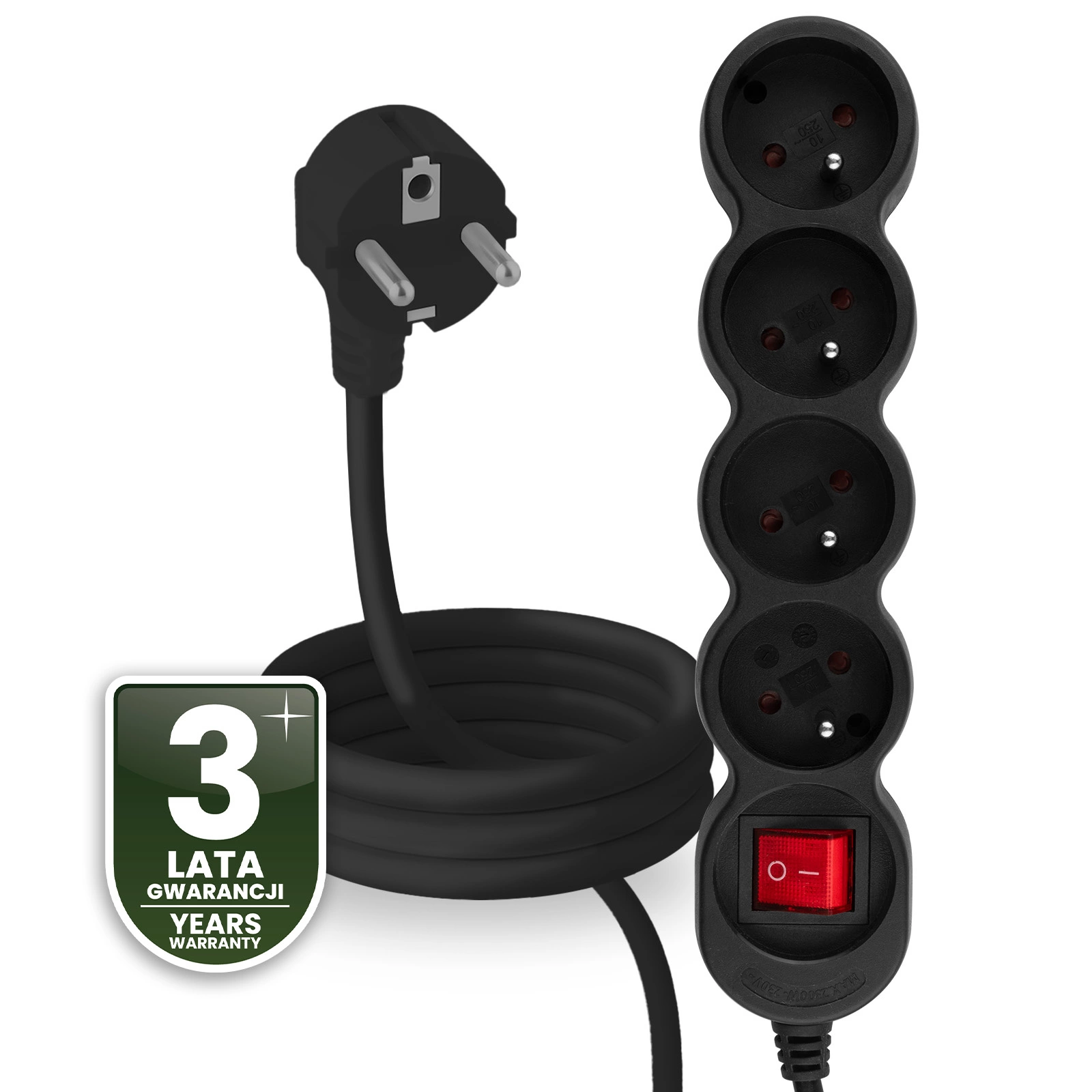 - Włącznik ON/OFF umożliwia szybkie odłączenie prądu, chroniąc urządzenia i ograniczając zużycie energii, gdy nie są używane.