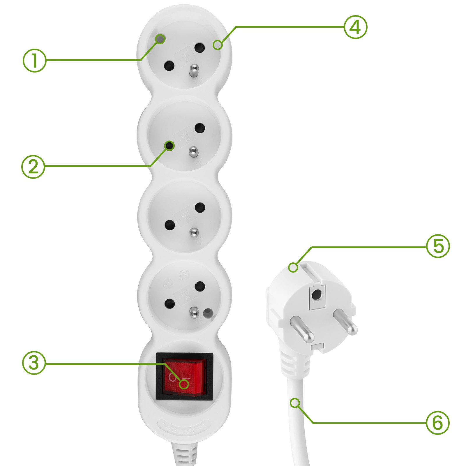 - 4 gniazda z uziemieniem chroni użytkownika i podłączone urządzenia przed skutkami przepięć oraz przeciążeń.