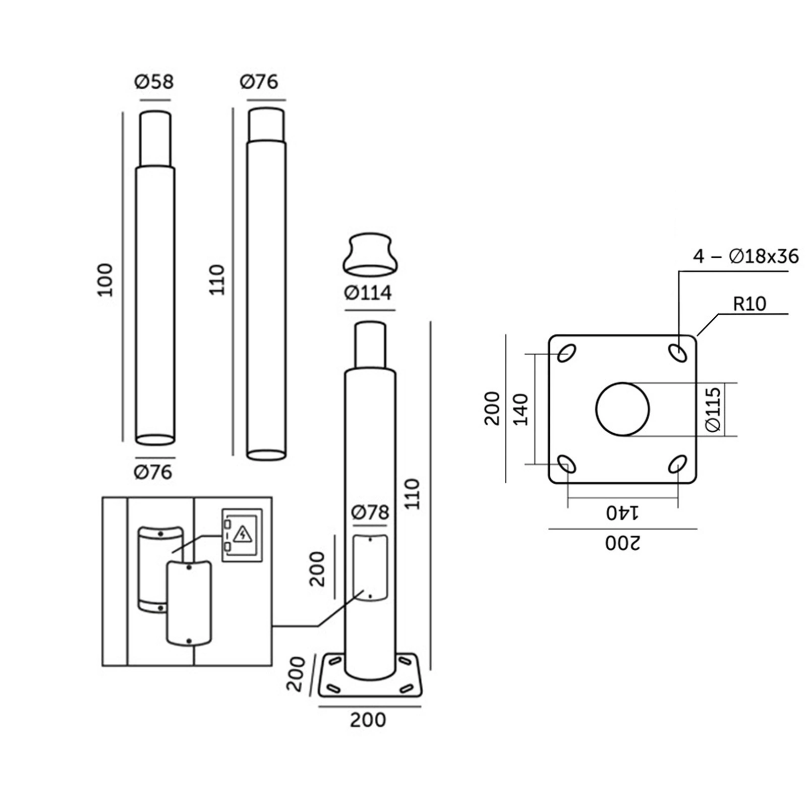 Słup wyposażony jest w komorę rewizyjną, która umożliwia montaż tablicy bezpiecznikowej, ułatwiając serwis oraz podłączenia instalacyjne. Średnica 60 mm pozwala na zastosowanie szerokiej gamy standardowych opraw oświetleniowych LED. Dzięki nośności do 25 kg konstrukcja zapewnia stabilny montaż nie tylko opraw, lecz także dodatkowych akcesoriów oświetleniowych. Podstawa słupa przystosowana jest do montażu na kotwie 200 × 200 mm, co gwarantuje pewne i bezpieczne osadzenie w fundamencie. Modułowa budowa (3 × 1 m) umożliwia łatwy transport, szybki montaż oraz rozbudowę systemu do wysokości 4 m przy użyciu dodatkowych przedłużek BASE SV.