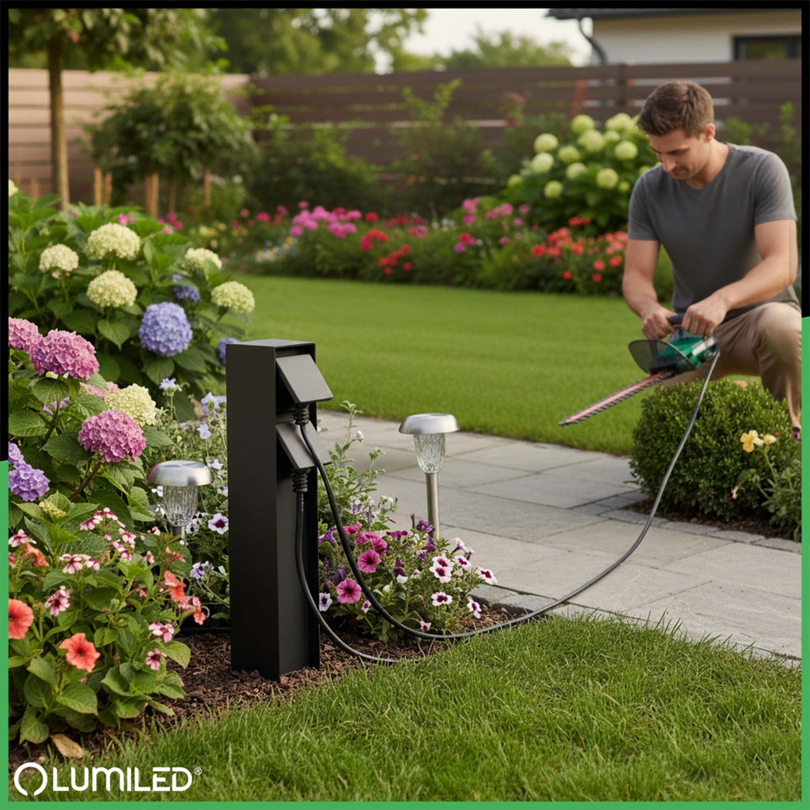 - Dwa gniazda SCHUKO zapewniają wygodne zasilanie urządzeń – od kosiarki po grill czy oświetlenie ogrodowe.