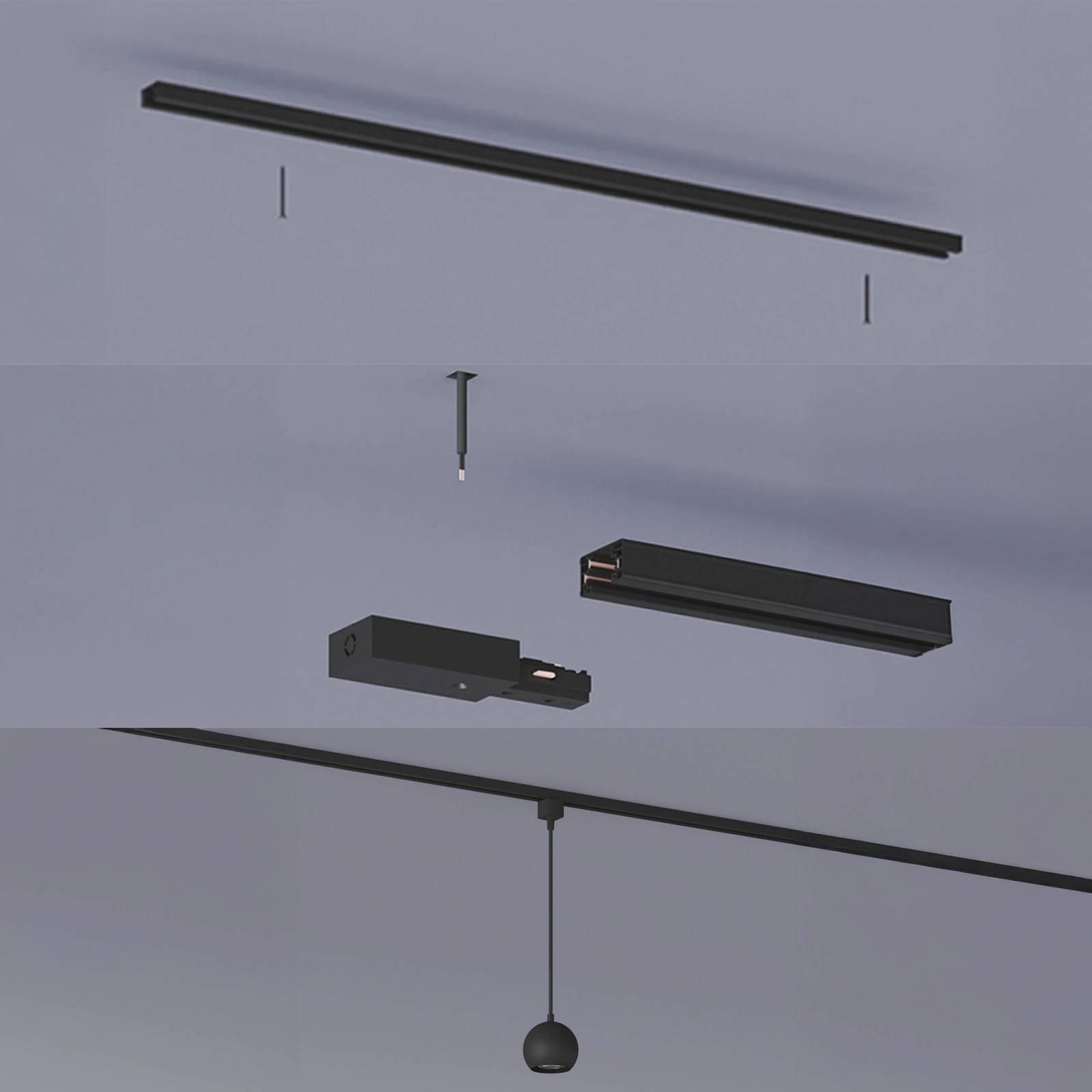 Szyna pełni rolę elementu rozszerzającego system, zapewniając spójność instalacji i możliwość dalszej rozbudowy bez ingerencji w istniejący układ. To rozwiązanie, które pozwala elastycznie rozwijać oświetlenie w miarę zmieniających się potrzeb aranżacyjnych. Czarna kolorystyka nadaje całości nowoczesnego, minimalistycznego charakteru i doskonale wpisuje się w aktualne trendy wnętrzarskie.