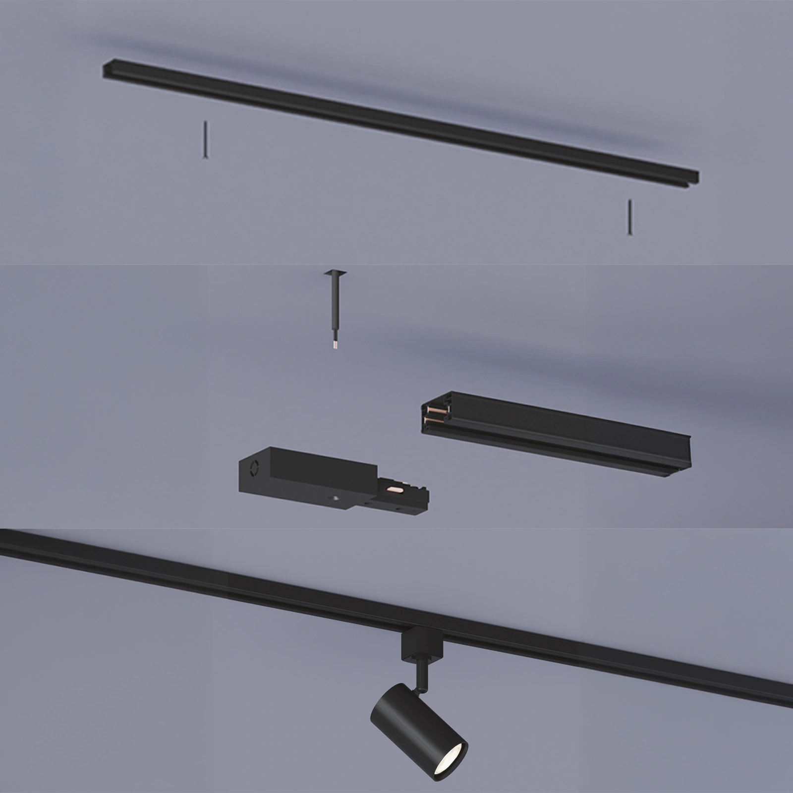 Szyna pełni funkcję centralnego elementu całego systemu, zapewniając spójność i możliwość dalszej rozbudowy. W zestawie znajduje się złączka zasilająca oraz zaślepka końcowa, co pozwala od razu estetycznie zakończyć instalację i przygotować ją do pracy. Czarna kolorystyka podkreśla nowoczesny, minimalistyczny charakter i doskonale komponuje się z aktualnymi trendami wnętrzarskimi.