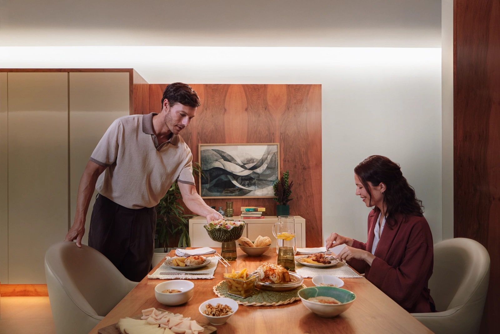 Stwórz atmosferę dopasowaną do swojego nastroju dzięki szerokiemu wyborowi kolorowych lub białych odcieni światła. Taśma LED zapewnia rozproszoną poświatę, która subtelnie oświetla ściany, podłogi i sufity, tworząc wyjątkowy klimat w Twoim domu. Technologia Chomasync™ umożliwia precyzyjne mieszanie kolorów, zapewniając płynne przejścia i harmonijny efekt świetlny. Dzięki możliwości przycięcia, taśma LED pasuje doskonale do każdego miejsca — od narożników po schody, od ścian po sufity. Dostosuj przestrzeń za pomocą dynamicznych efektów świetlnych i scen, które dopasują się do każdej okazji i nastroju.