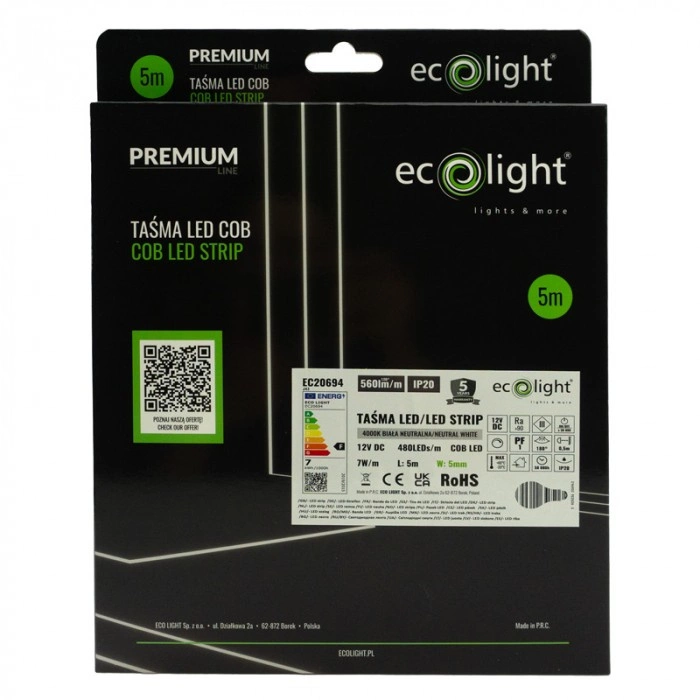 - Wyjątkowa wydajność świetlna: Dzięki 480 diodom COB na metr, taśma LED Ecolight oferuje imponujący strumień świetlny 560 lm/m.