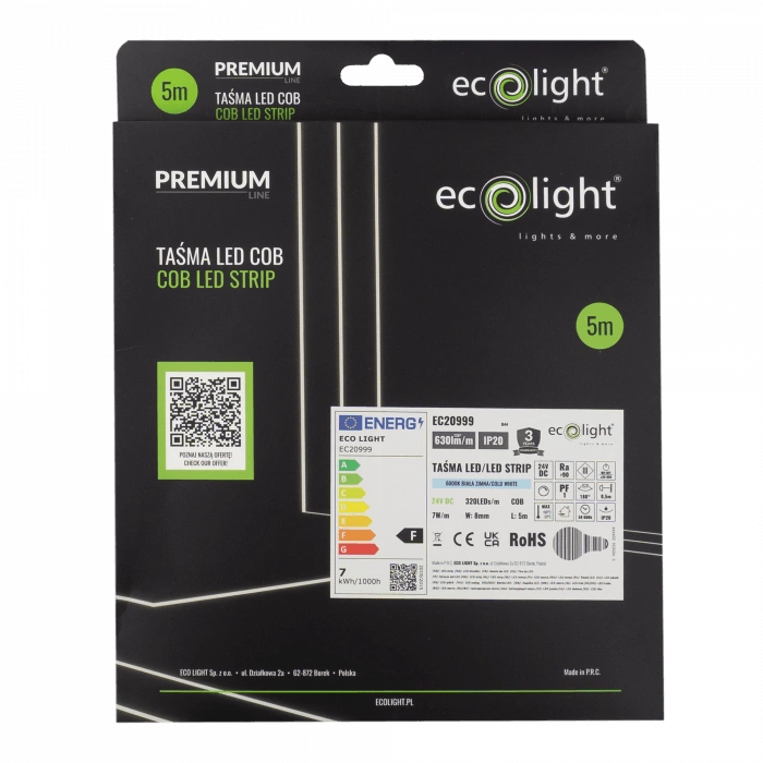 - Wyjątkowa jasność i równomierne oświetlenie - Taśma LED COB o mocy 7W/m i 320 diodach na metr, oferuje imponujący strumień świetlny 630lm/m bez efektu migotania.