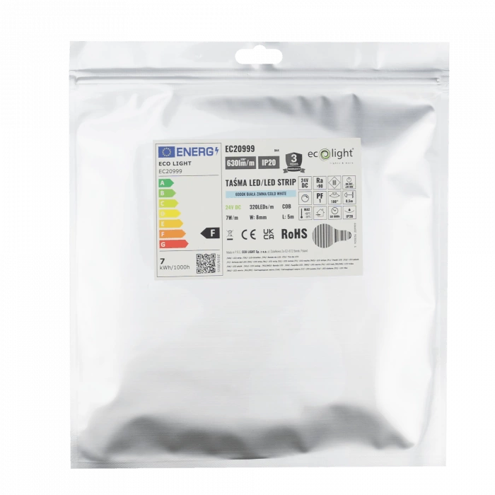 Odkryj nowy wymiar oświetlenia dzięki naszej rewolucyjnej taśmie LED. Taśma COB o mocy 7W/m i strumieniu świetlnym 630lm/m oferuje wyjątkowo żywe i jasne światło, idealne do tworzenia niepowtarzalnej atmosfery w Twoim domu. Z 4000K neutralną barwą światła, uzyskasz efekt, który doskonale wpisuje się w każde wnętrze, od salonu, poprzez sypialnię, aż po jadalnię. Dzięki zintegrowanym diodom LED o wysokiej gęstości 320LED/m, nasza taśma zapewnia równomierne oświetlenie bez efektu migotania.