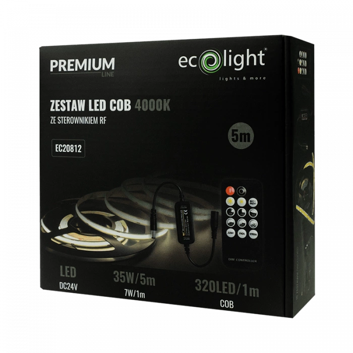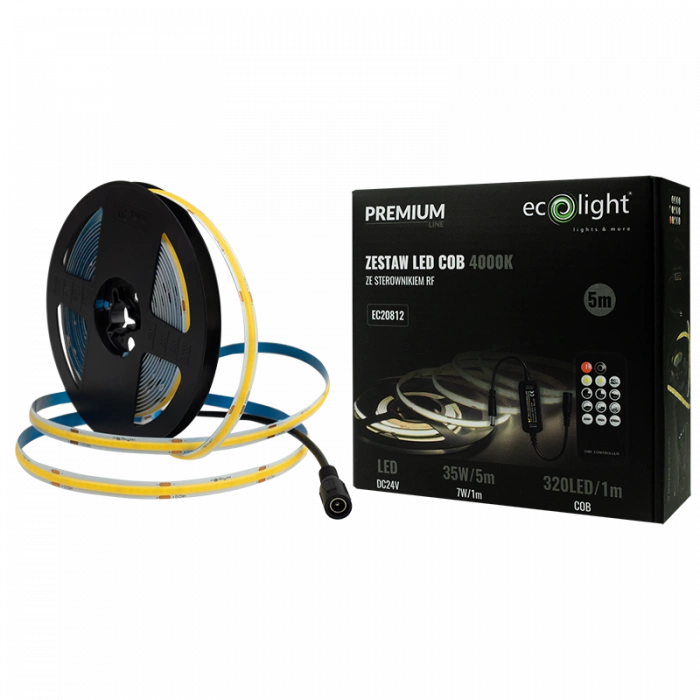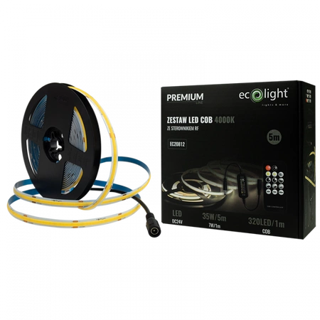 Taśma LED Pasek COB 7W/m 630lm/m 320LED/m 24V 4000K Neutralna IP20 Rolka 5m + Zasilacz + Pilot Ecolight