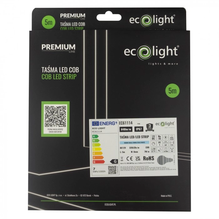 Odkryj nowoczesne oświetlenie z taśmą LED Pasek COB od Ecolight! Ta innowacyjna taśma LED zapewnia moc, jakiej potrzebujesz, z mocą znamionową 35W na 5-metrową rolkę. Dzięki strumieniowi świetlnemu 4200 lm zyskasz idealne, jasne światło do każdego wnętrza, a skuteczność świetlna na poziomie 120 lm/W gwarantuje ekonomiczne zużycie energii. Wykorzystując 320 diod na metrze, taśma LED tworzy efekt płynnego, jednolitego światła, doskonałego do nowoczesnych aranżacji.