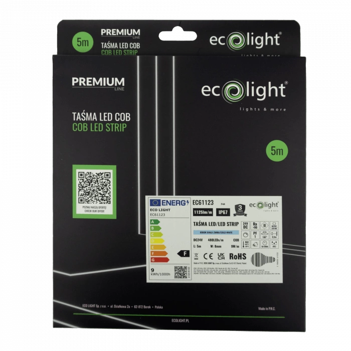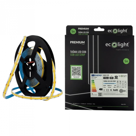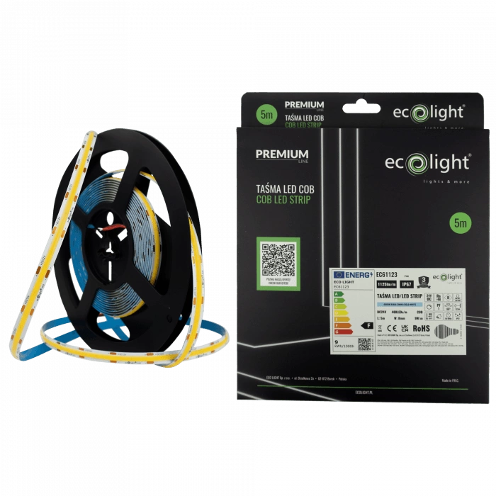 Odkryj niezwykłą moc oświetlenia z taśmą LED COB 24V, która łączy w sobie doświadczenie marki ECO LIGHT z najwyższą technologią świetlną. Dzięki oszałamiającej jasności 1125 lumenów na metr oraz zimnej białej barwie światła o temperaturze 6000K, ta taśma jest doskonałym rozwiązaniem do przestrzeni roboczych, magazynów i warsztatów. Zintegrowana technologia COB oraz duża gęstość diod 480 LED/m gwarantują jednolite, intensywne światło bez nieestetycznych punktów świetlnych.
