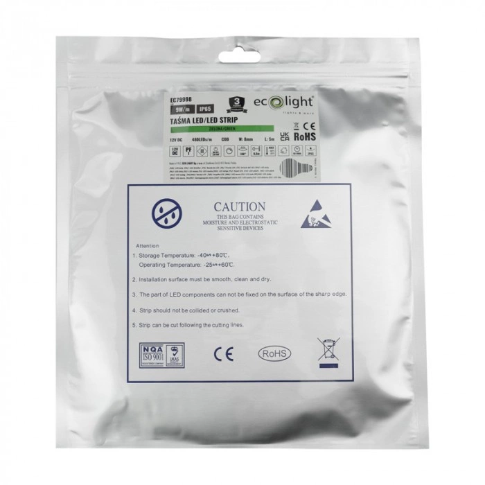 Odkryj magię zielonego światła z Taśmą LED COB 9W/m 480LED/m 12V! Ta innowacyjna taśma LED przeniesie Twoją przestrzeń na zupełnie nowy poziom, oferując intensywną i żywą barwę zieloną, którą pokochają wszyscy domownicy i goście. Dzięki mocy 9W/m i imponującemu strumieniowi świetlnemu 990lm/m, to zaawansowane rozwiązanie LED zapewnia szerokie i równomierne oświetlenie. Wybierz to energooszczędne rozwiązanie, które dzięki stopniowi ochrony IP65, będzie Ci służyło zarówno wewnątrz, jak i na zewnątrz.