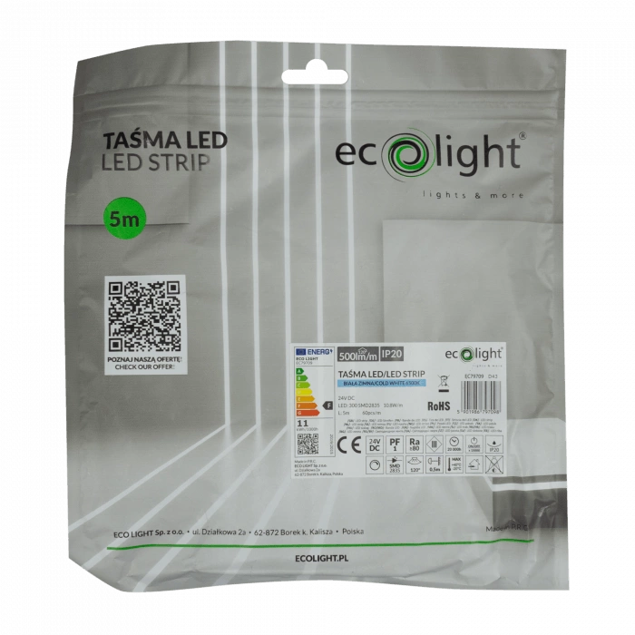 Nasza taśma LED jest o stopniu ochrony IP20, co czyni ją bezpiecznym rozwiązaniem do zastosowania wewnętrznego. Dzięki standardowemu zasilaniu 24V DC, jest ona nie tylko efektywna, ale także niezawodna. Elegancka szerokość 8mm oraz prosta instalacja sprawiają, że łatwo dopasujesz ją do wszelkich przestrzeni, w tym trudno dostępnych miejsc. Bez wątpienia, taśma LED Ecolight to nie tylko oświetlenie, to inwestycja w piękną i nowoczesną przestrzeń!