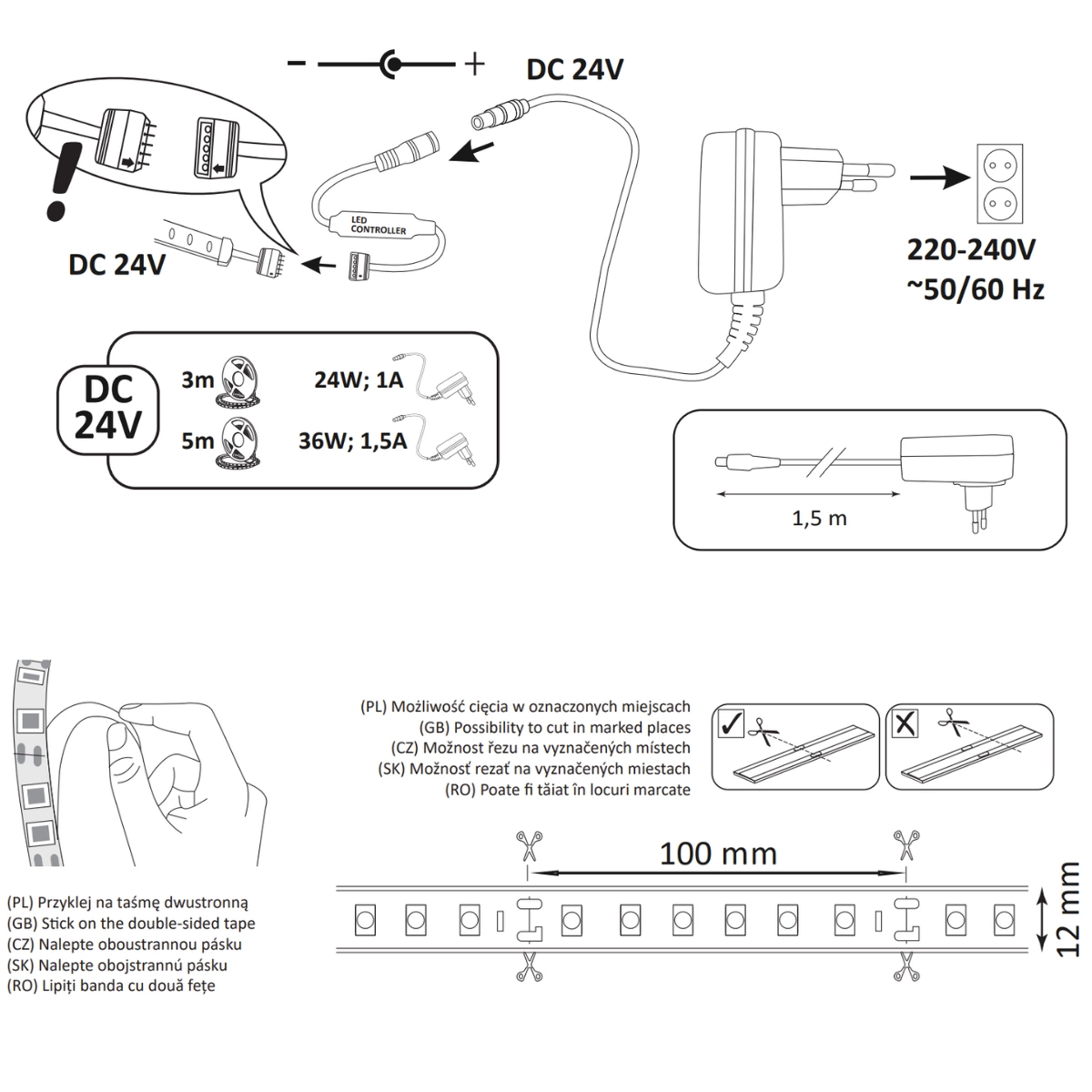 - Łatwość obsługi: Komplet zawiera kontroler, pilot RF i zasilacz, co pozwala na łatwe sterowanie i szybki montaż bez potrzeby dodatkowych narzędzi czy okablowania.