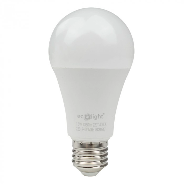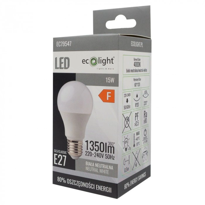 Odkryj nową jakość oświetlenia z żarówką LED Ecolight A60! Ta wyjątkowa żarówka o mocy 15W oferuje strumień świetlny na poziomie 1350 lumenów, co zapewnia doskonałe oświetlenie każdego pomieszczenia. Neutralna, biała barwa światła o temperaturze 4000K jest idealna do domowego biura, kuchni lub salonu, tworząc przytulną i jednocześnie funkcjonalną atmosferę. Kształt tradycyjnej bańki A60 oraz uniwersalny trzonek E27 sprawiają, że pasuje do większości lamp w Twoim domu.