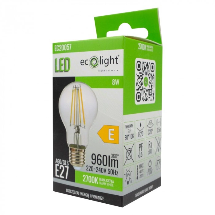 Odkryj moc nowoczesnego oświetlenia z żarówką LED A60 E27 8W firmy Ecolight! Ta wyjątkowa żarówka to połączenie oszczędności energii i wyjątkowej wydajności. Dzięki mocy znamionowej 8W i świetlności rzędu 960lm, doskonale oświetli każde pomieszczenie, tworząc przytulną atmosferę dzięki barwie ciepłej białej o temperaturze 2700K. Wyjątkowy design typu filament oraz tradycyjny kształt żarówki A60 doskonale wkomponują się w każde wnętrze, nadając mu nowoczesny charakter.