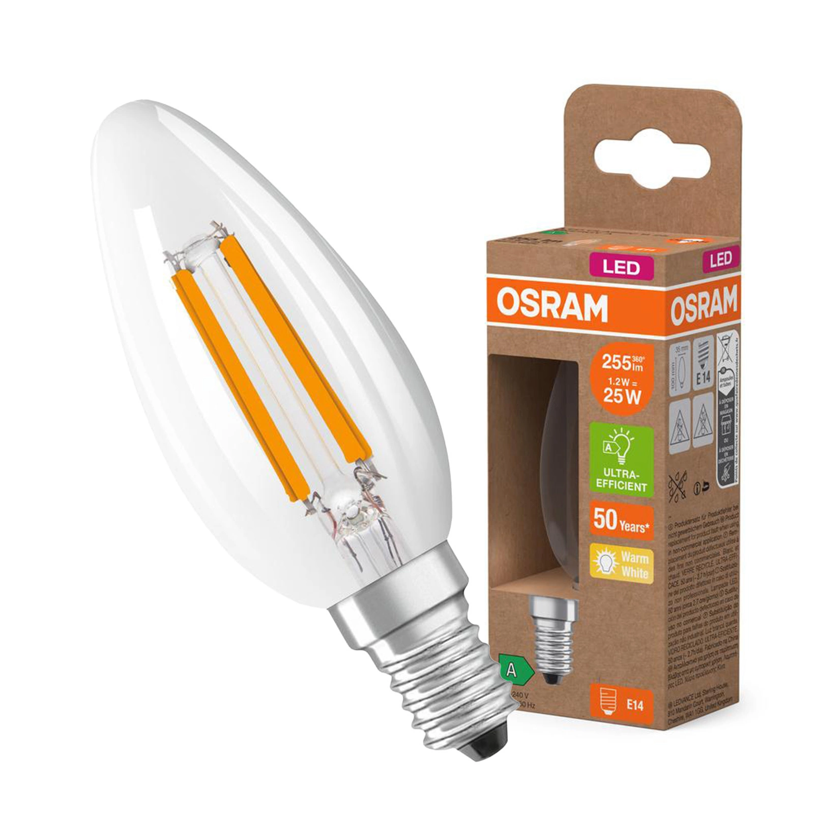• Wydajność energetyczna: Żarówka LED OSRAM zużywa jedynie 1.2W, oferując jednocześnie strumień świetlny 255 lm, co stanowi doskonały zamiennik dla tradycyjnych żarówek 25W.