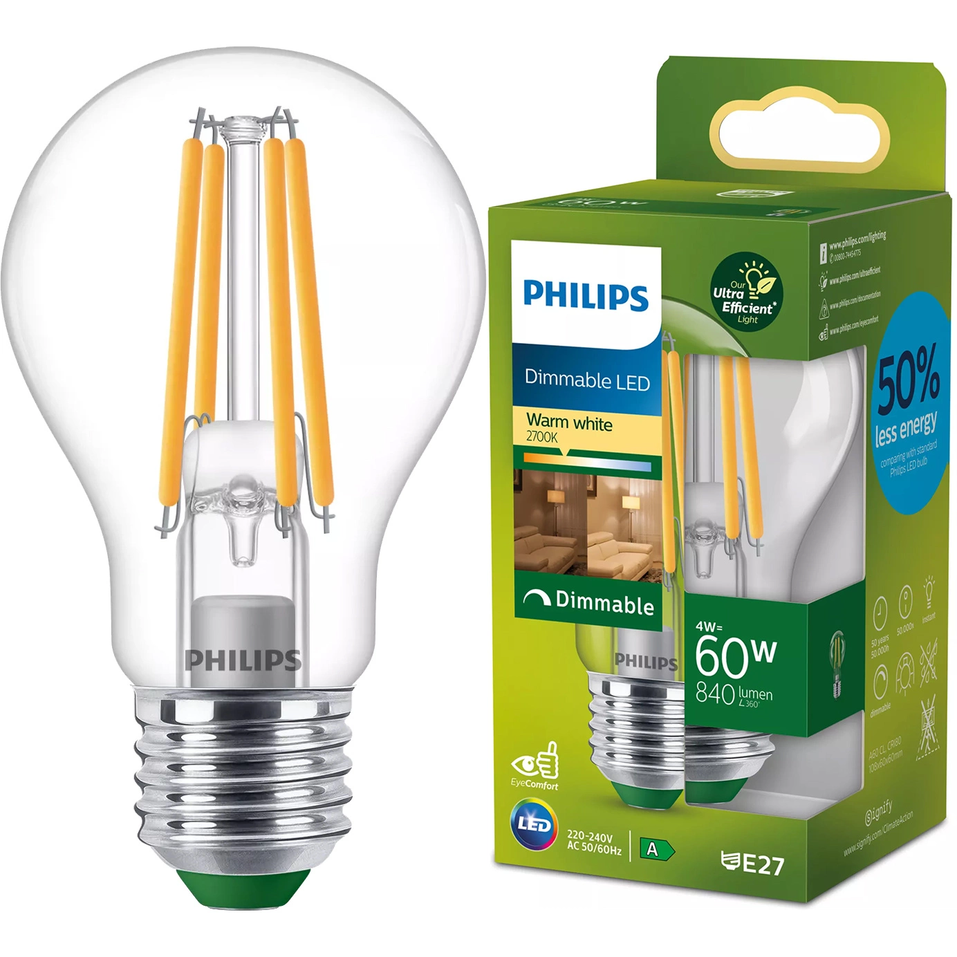Żarówka LED E27 A60 4W = 60W 840lm 210lm/W 2700K Ciepła 300° Ściemnialna KLASA A UltraEfficient Philips