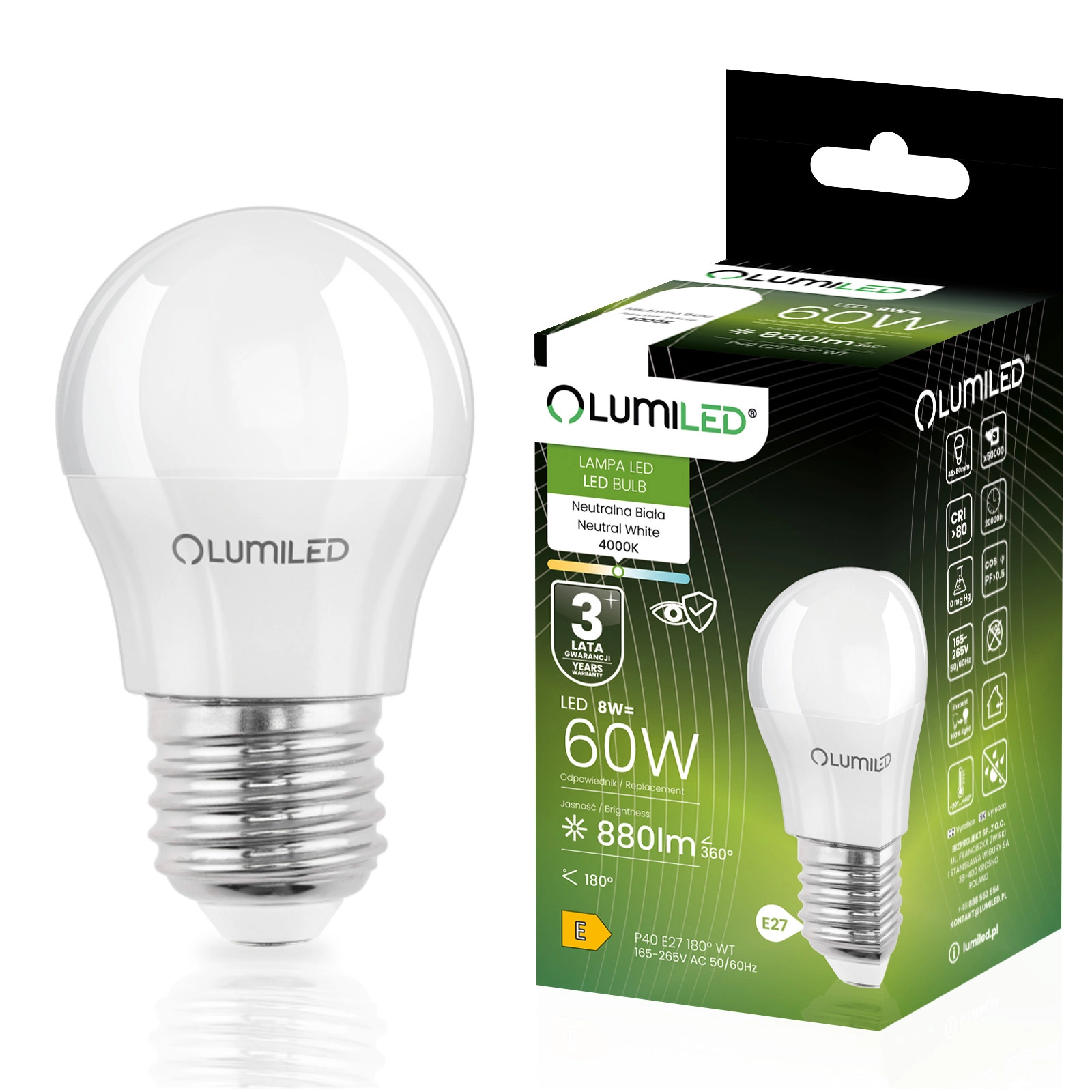 Żarówka LED E27 Kulka P45 8W = 60W 880lm 4000K Neutralna 180° LUMILED