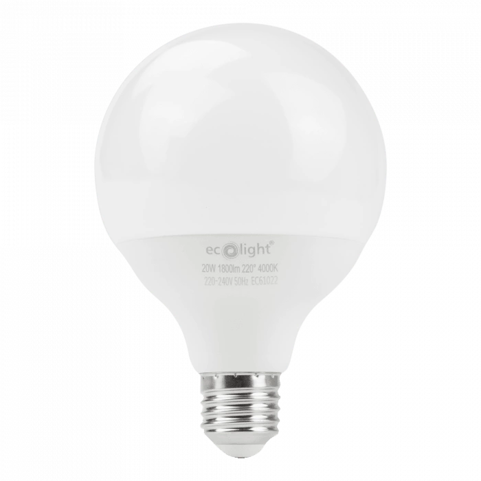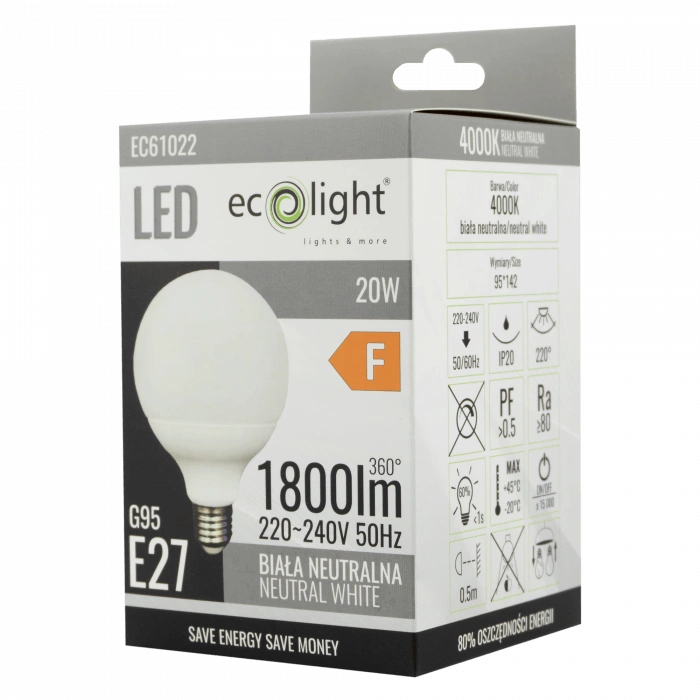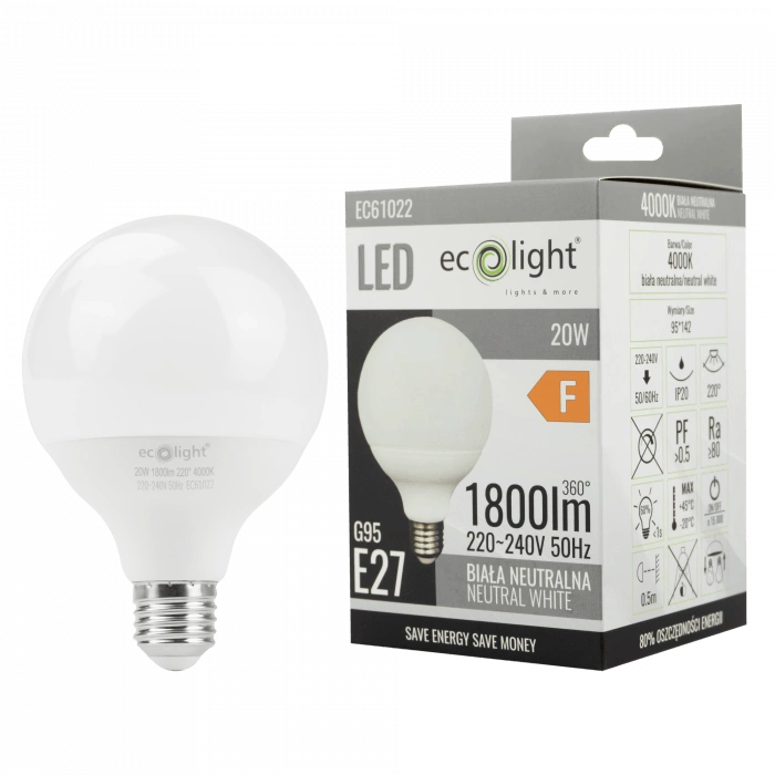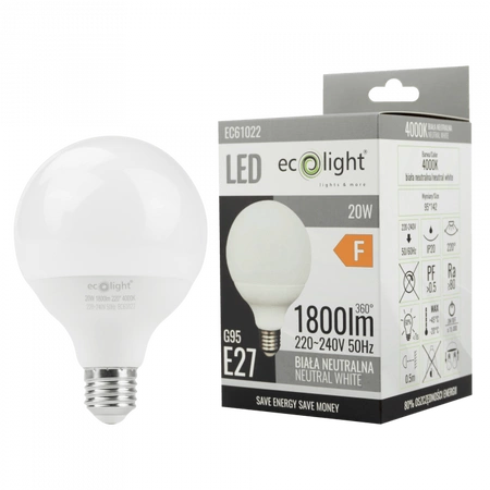 Oświetl swoje wnętrza za pomocą żarówki LED Kula G95 E27 20W 1800lm 4000K od Ecolight. Ta żarówka łączy w sobie nowoczesny design i wysoką wydajność energetyczną, co czyni ją doskonałym wyborem do każdego pomieszczenia. Dzięki neutralnej białej barwie (4000K) zapewnia doskonałe warunki do pracy oraz tworzy przyjazną atmosferę w całym domu. Jej moc (20W) pozwala generować intensywny strumień świetlny (1800 lm), zastępując tradycyjne źródła światła przy znacznie niższym zużyciu energii.