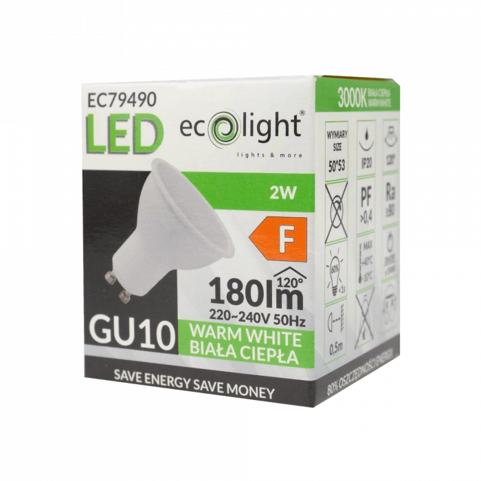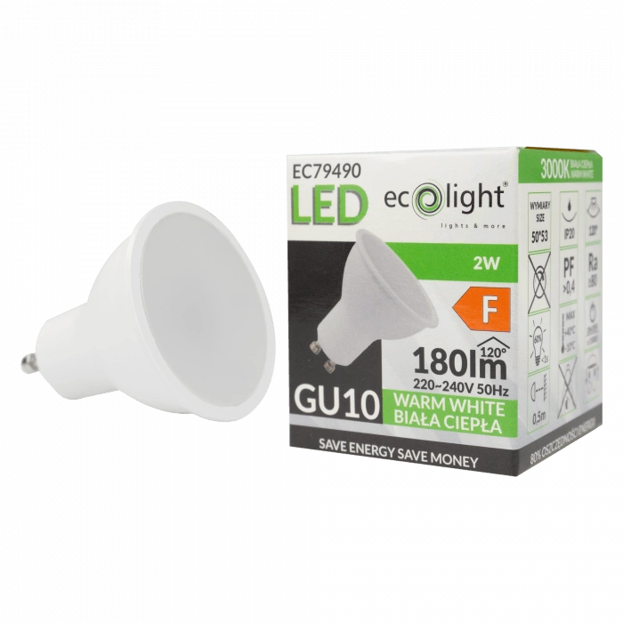 Produkt cechuje się trzonkiem GU10 oraz nominalnym napięciem 220-240V, co zapewnia jego kompatybilność z większością opraw oświetleniowych na rynku. Wykonana z trwałego tworzywa sztucznego w mlecznym kolorze przesłony, zapewnia doskonałą ochronę przed uszkodzeniami i żywotność do 20 000 godzin. Postaw na jakość i ekologię z nowoczesną żarówką Ecolight.