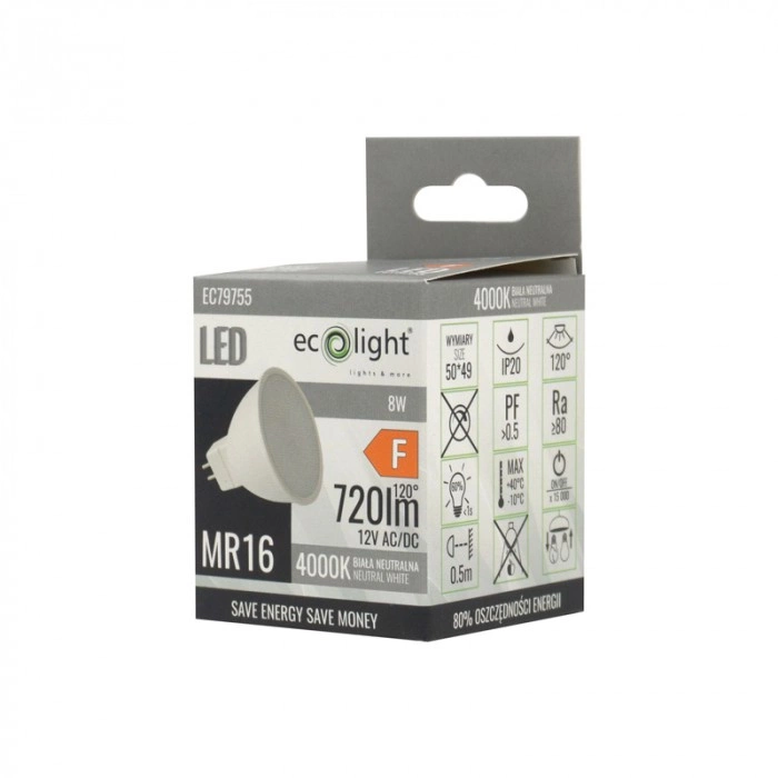Ta ekonomiczna żarówka pasuje do trzonka GU5.3 i działa przy 12V prądzie stałym, co czyni ją elastycznym rozwiązaniem do różnych instalacji oświetleniowych. Szeroki kąt rozsyłu światła 120° sprawia, że wnętrze zostaje równomiernie oświetlone, a jej skuteczność świetlna wynosząca 80 lm/W redukuje koszty energii. Wybierz jakość i niezawodność marki ECO LIGHT, by oświetlić swoje życie!