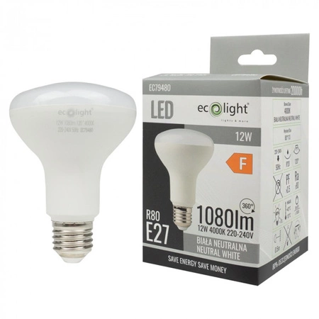 Odkryj świat żywych kolorów i energooszczędności dzięki naszej żarówce LED Reflektor R80 E27 12W 1080lm 4000K Neutralna Ecolight. Idealna do różnorodnych zastosowań, od salonów po kuchnie, ta żarówka zapewni Ci optymalne oświetlenie każdego pomieszczenia. Dzięki strumieniowi świetlnemu 1080 lumenów i neutralnej temperaturze barwowej 4000K stworzysz komfortową atmosferę bez męczącego dla oczu blasku.