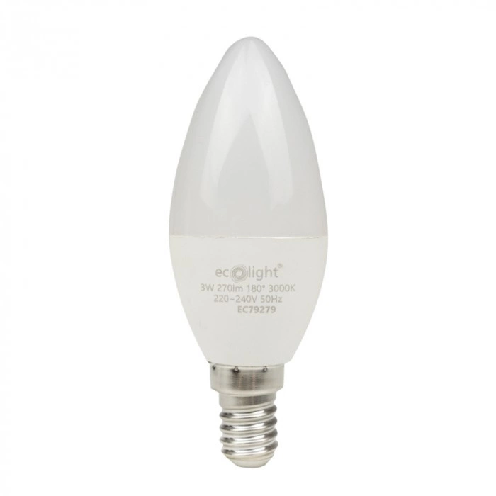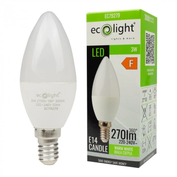 Odkryj moc efektywnego oświetlenia z naszą nowoczesną żarówką LED typu świeczka B37 Ecolight! Ta niezwykle oszczędna żarówka o mocy znamionowej 3W zapewnia strumień świetlny 270lm, co czyni ją idealnym rozwiązaniem do tworzenia przytulnej atmosfery w każdym pomieszczeniu. Jej ciepła barwa światła o temperaturze barwowej 3000K sprawia, że wnętrza stają się wyjątkowo przyjemne i komfortowe.