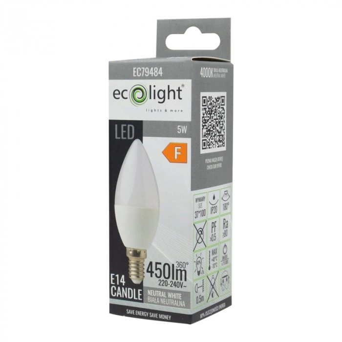 Przedstawiamy Żarówkę LED Świeczka B37 E14 5W 450lm 4000K od ECO LIGHT - idealne rozwiązanie, które połączy wydajność energetyczną z eleganckim wyglądem. Dzięki mocy znamionowej 5W i strumieniowi świetlnemu 450lm, ta żarówka zapewnia doskonałe oświetlenie, stosując jedynie 1/10 energii w porównaniu do tradycyjnych źródeł światła. Jej biała neutralna barwa o temperaturze 4000K tworzy przyjemną atmosferę w każdym pomieszczeniu, idealną zarówno do pracy, jak i do relaksu.