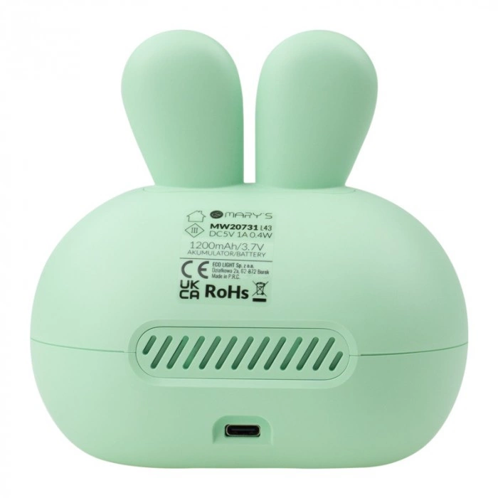 Mary's Budzik Królik wykonany z trwałego i bezpiecznego materiału ABS charakteryzuje się napięciem wejściowym 5V DC oraz mocą 0.4W, co gwarantuje stabilne i efektywne działanie. Urządzenie oferuje czas pracy od 10 do 100 godzin, w zależności od wybranych ustawień, i może być łatwo ładowane za pomocą dołączonego kabla USB. To idealne rozwiązanie dla każdego, kto ceni praktyczność połączoną z wyjątkowym designem. Spraw, by każdy poranek był przyjemniejszy z tym wyjątkowym produktem!