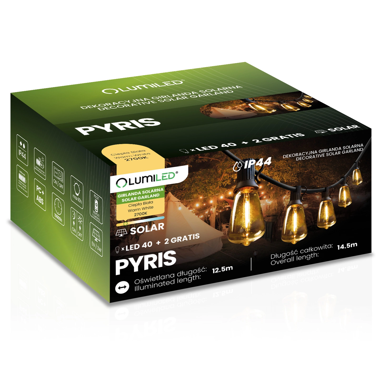Wysoka jakość wykonania, wbudowany czujnik zmierzchu, trwałość do 10000h oraz odporność na warunki atmosferyczne IP44 sprawiają, że PYRIS to girlanda na każdą porę roku. Adapter w zestawie zapewnia stabilne zasilanie, nawet w pochmurne dni.
