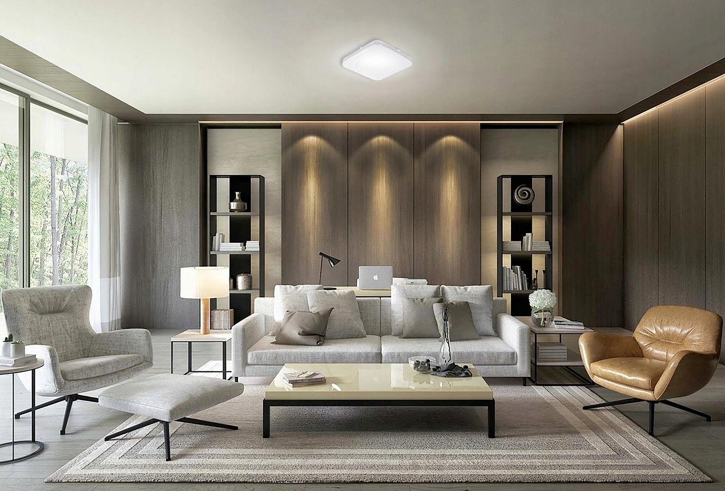 Nowoczesny plafon LED został wyposażony w 40 diod LED SMD , oferujących możliwość ściemniania oraz zmiany barwy i koloru światła. Urządzenie można regulować za pomocą dołączonego pilota, który umożliwia dostosowanie intensywności światła, przejście z barwy ciepłej na neutralną lub zimną. Pilot działa radiowo, co zapewnia wygodę użytkowania bez konieczności kierowania go w stronę plafonu, by zmienić ustawienia.
