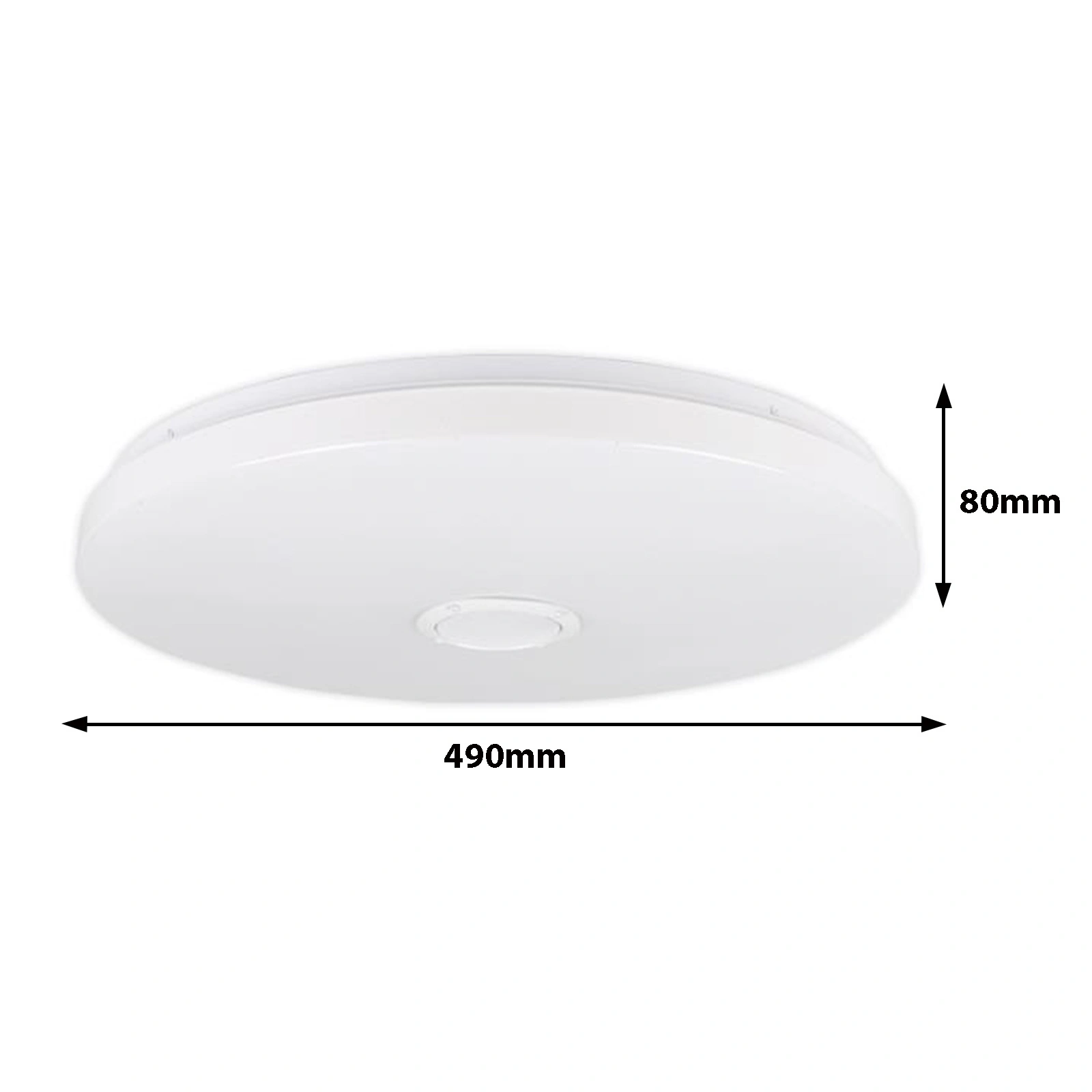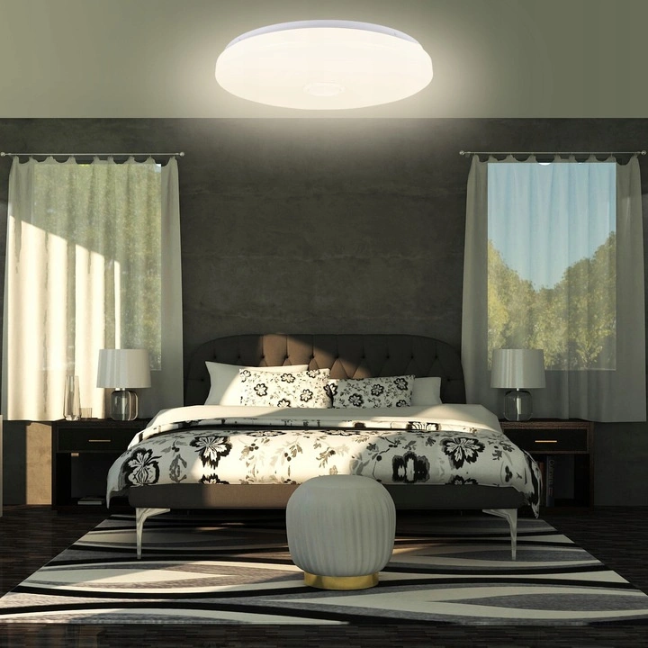 Nowoczesny plafon LED został wyposażony w 60 diod LED SMD 2835 oraz 45 diod LED SMD 5050 RGB, oferujących możliwość ściemniania oraz zmiany barwy i koloru światła. Urządzenie można regulować za pomocą dołączonego pilota, który umożliwia dostosowanie intensywności światła, przejście z barwy ciepłej na neutralną lub zimną. Pilot działa radiowo, co zapewnia wygodę użytkowania bez konieczności kierowania go w stronę plafonu, by zmienić ustawienia.