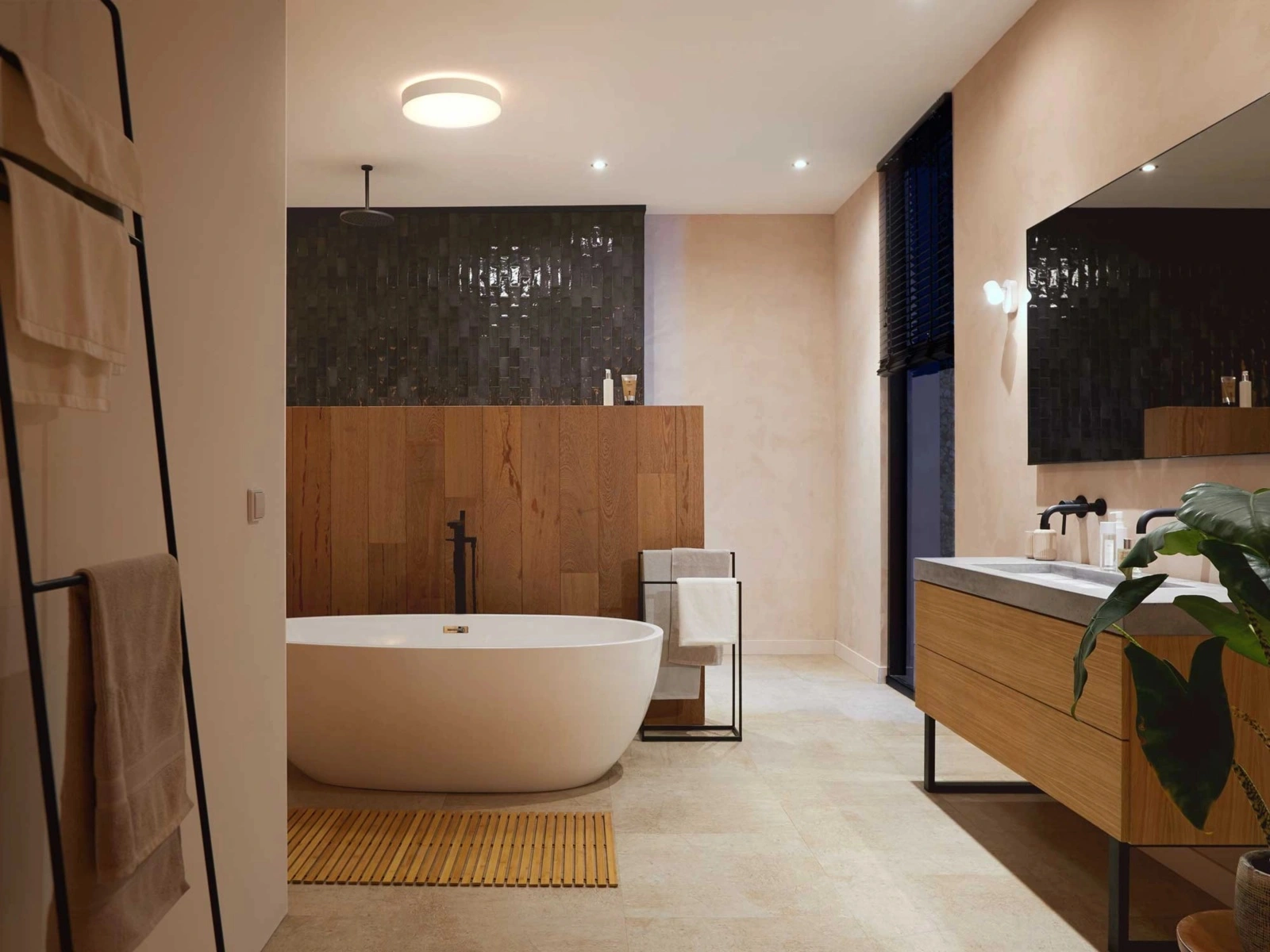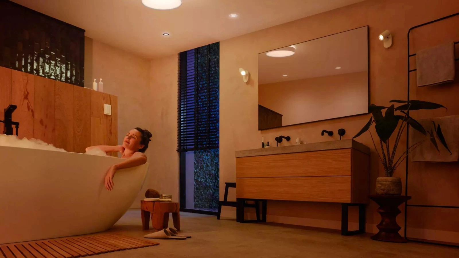 Dobierz światło idealne do każdej chwili – od ciepłego, złocistego blasku po chłodne, jasne oświetlenie. Wybieraj spośród ponad 50 000 odcieni bieli, aby nadać łazience wyjątkową atmosferę dopasowaną do pory dnia i nastroju. Jasne światło pobudzi Cię o poranku, a delikatna, przygaszona poświata stworzy spokojny klimat do wieczornego relaksu.