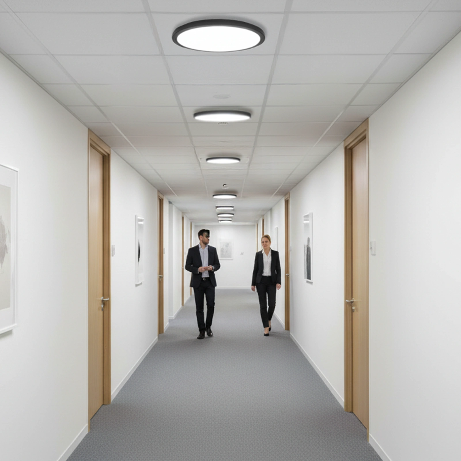 - Korytarze i ciągi komunikacyjne – zapewnia równomierne oświetlenie o szerokim kącie, które nie pozostawia ciemnych zakamarków.