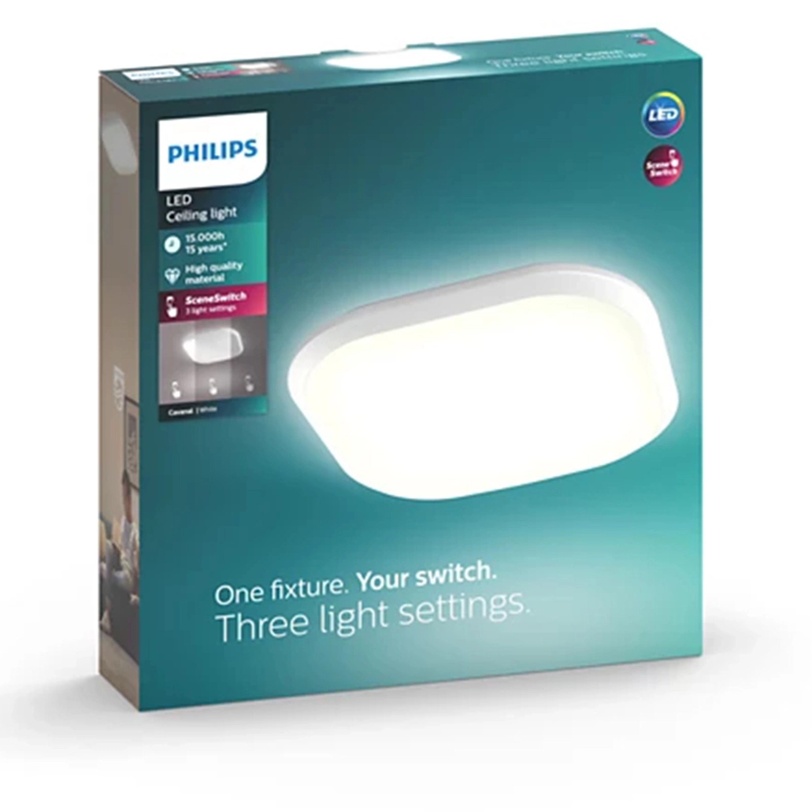 Lampa sufitowa CAVANAL 40K marki Philips jest wyposażona w funkcję SceneSwitch Brightness Change. Dzięki tej funkcji, możesz dostosować jasność diod LED bez konieczności montowania ściemniacza. Za pomocą zwykłego włącznika światła, masz możliwość łatwego przełączania między trzema poziomami jasności. Warto zauważyć, że ta lampa nie jest przeznaczona do użytku ze ściemniaczem.
