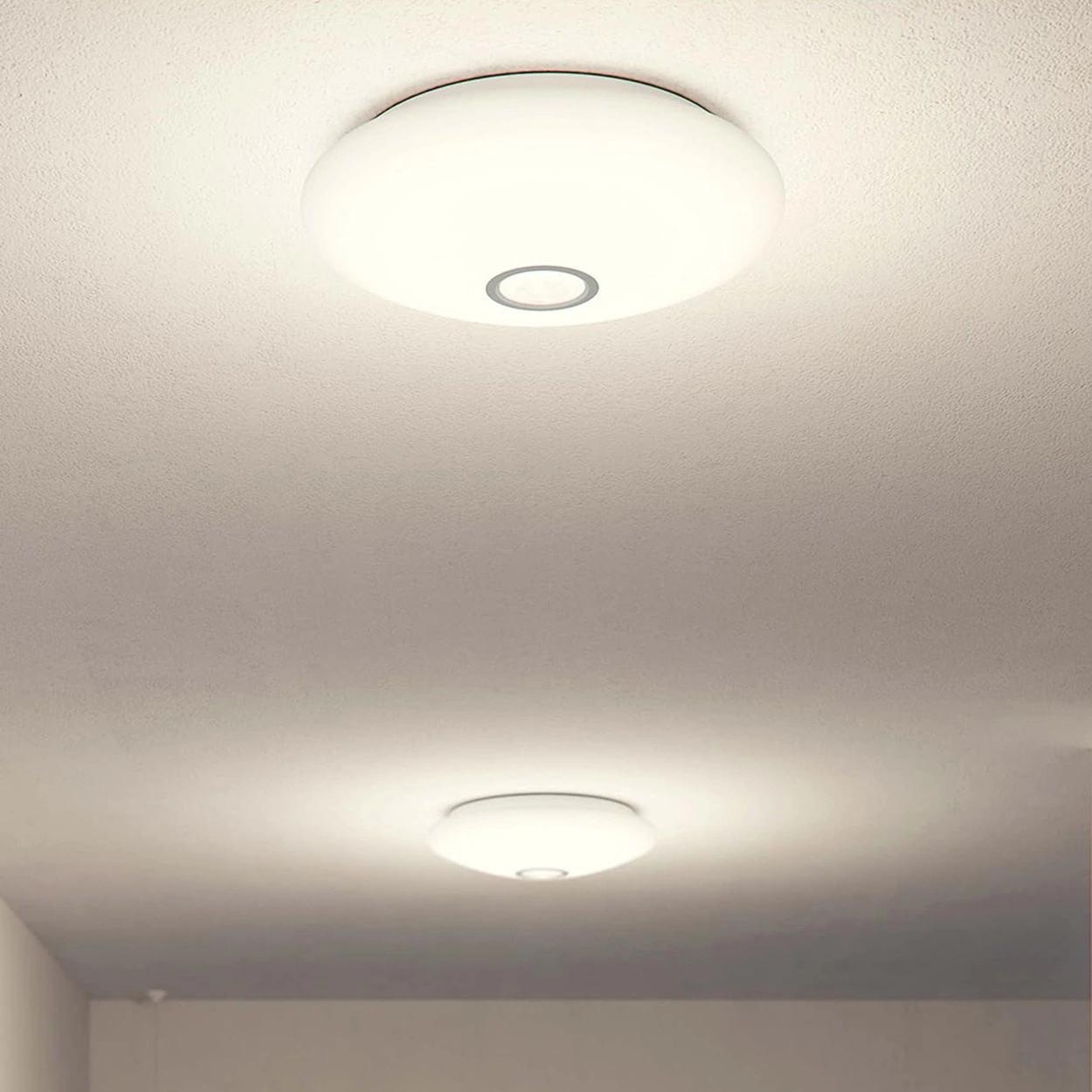 • Nowoczesne wzornictwo – Okrągły kształt i uniwersalne, białe wykończenie sprawiają, że plafon doskonale komponuje się z różnymi stylami wnętrz.