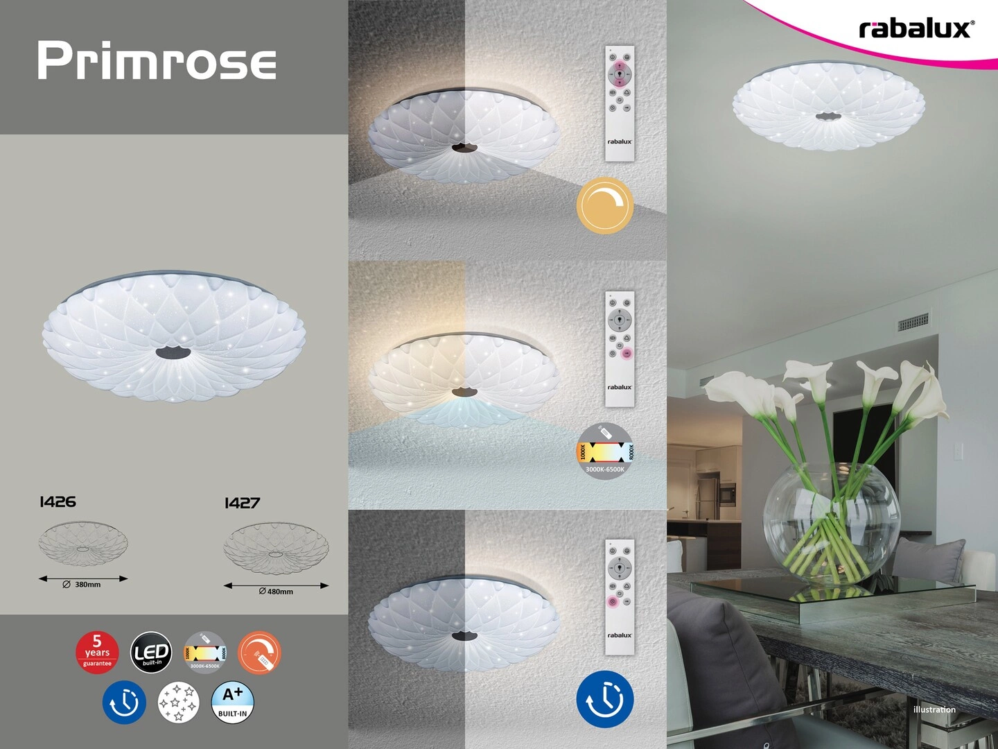 Plafon LED Lampa Sufitowa Primrose Rabalux to idealne rozwiązanie dla miłośników nowoczesnego oświetlenia. Dzięki mocy 72W oraz strumieniowi świetlnemu wynoszącemu 4320 lumenów, lampa ta zapewnia doskonałe oświetlenie w każdym pomieszczeniu. Ponadto, możliwość regulacji temperatury barwowej od 3000K do 6500K pozwala stworzyć atmosferę dostosowaną do okazji, niezależnie czy potrzebujemy przytulnego, ciepłego światła, czy bardziej stymulującego, chłodnego oświetlenia. Lampa jest również ściemnialna, co daje możliwość dostosowania intensywności światła do indywidualnych preferencji.