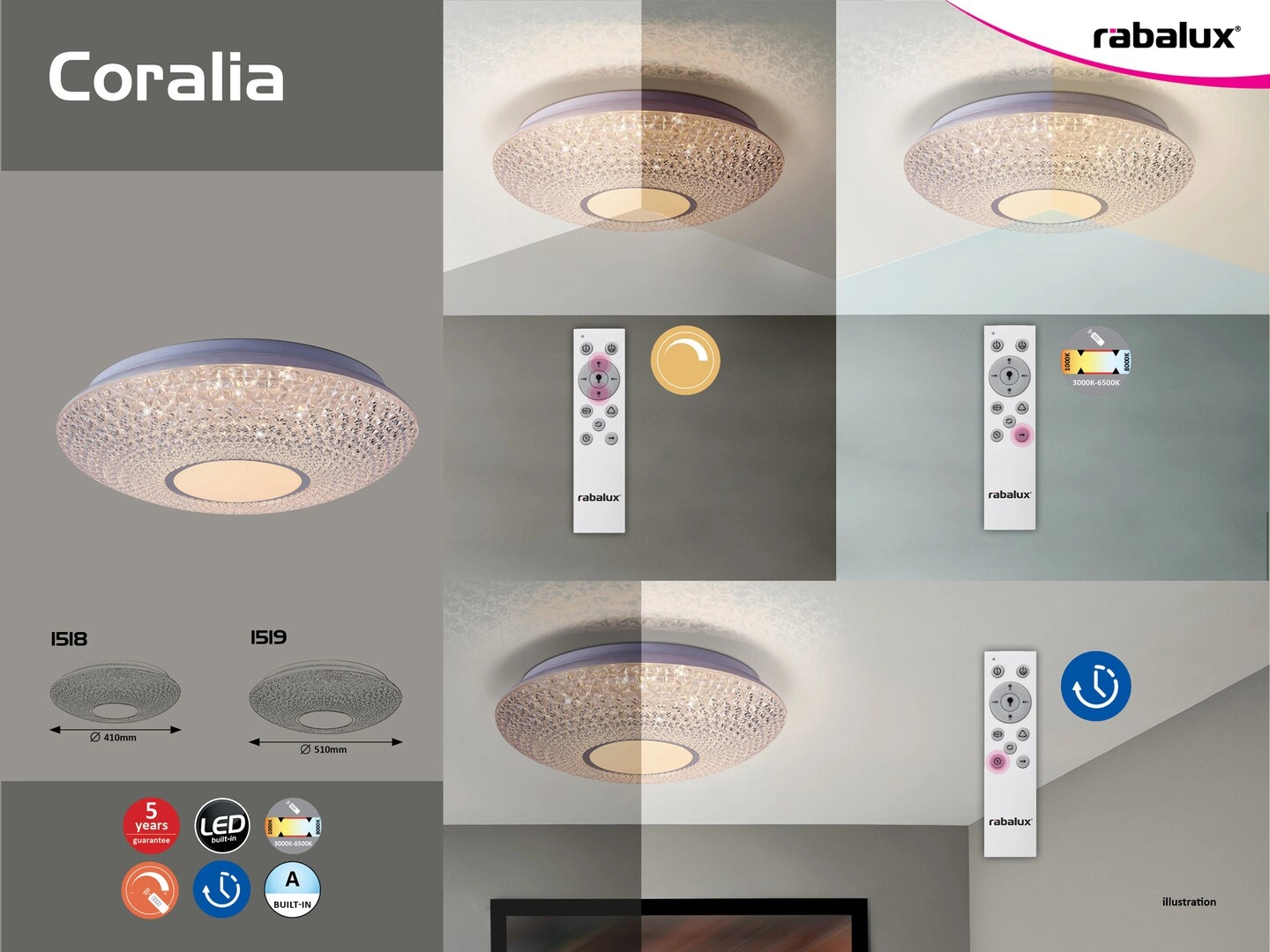 Plafon LED Coralia wyposażony jest w funkcję ściemniania, co umożliwia pełną kontrolę intensywności światła za pomocą dołączonego pilota. Transparentne wykończenie dodaje nowoczesności i subtelności, idealnie komponując się z różnymi stylami wnętrzarskimi, od minimalistycznych po klasyczne. Montaż natynkowy sprawia, że instalacja jest szybka i łatwa, a uniwersalne wzornictwo sprawia, że lampa pasuje zarówno do salonu, sypialni, jak i biura. Wybierając tę oprawę, inwestujesz w rozwiązanie, które łączy w sobie walory estetyczne i nowoczesne technologie.