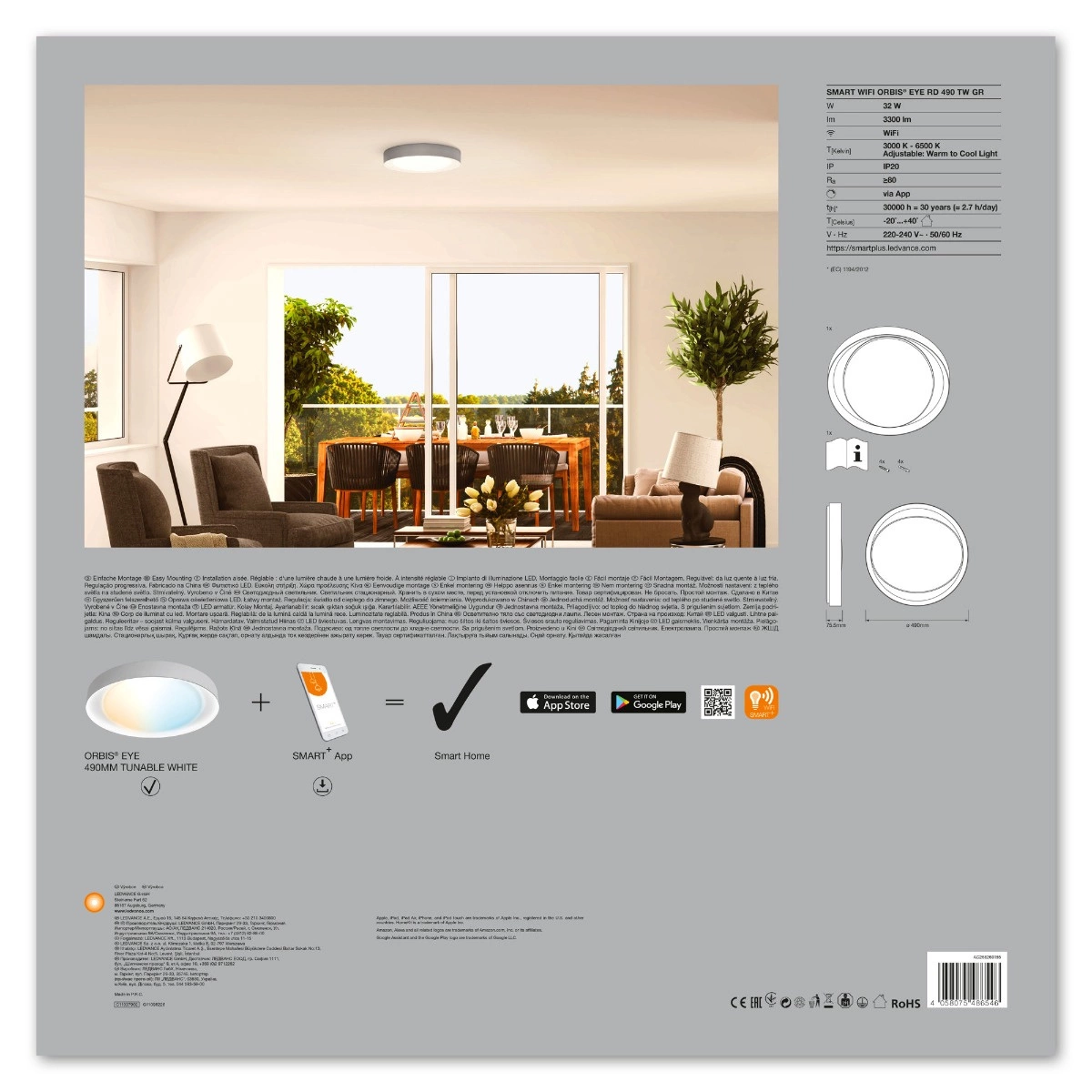 Nowoczesny PLAFON LED EYE w kolorze szarym, wykonany ze szkła akrylowego (polimetakrylan metylu PMMA), uznanej na rynku oświetleniowym marki LEDVANCE z serii SMART+ ORBIS to oświetlenie domowe z inteligentnym sterowaniem aplikacją WiFi, które cechuje się bardzo dobrą jakością emitowanego światła oraz wysoką trwałością. Profesjonalne wykonanie, oraz wykorzystanie najnowszej technologii LED sprawia, że prezentowany plafon spełni swoje zadanie. Plafon LED LEDVANCE został wyposażony w energooszczędne źródło światła LED o mocy 32W, strumieniu świetlnym równym 3300lm, a dzięki SMART+ możemy regulować temperaturę barwy w zakresie od przyjemnej ciepłej poprzez neutralną, aż do zimnej (3000K-6500K), to program Tunable White, jest to możliwe, przy pomocy kompatybilnego systemu inteligentnego domu. W prosty sposób możesz zmienić ciepłą barwę światła na zimną lub neutralną. Barwa światła wpływa na Twój nastrój i samopoczucie, ciepłe światło sprzyja relaksowi, natomiast zimne bądź neutralne światło pobudza Cię do działania. Idealnie oświetli wnętrze Twojego biura, kuchni, salonu lub pokoju. Plafon posiada kąt świecenia, równy 110°.