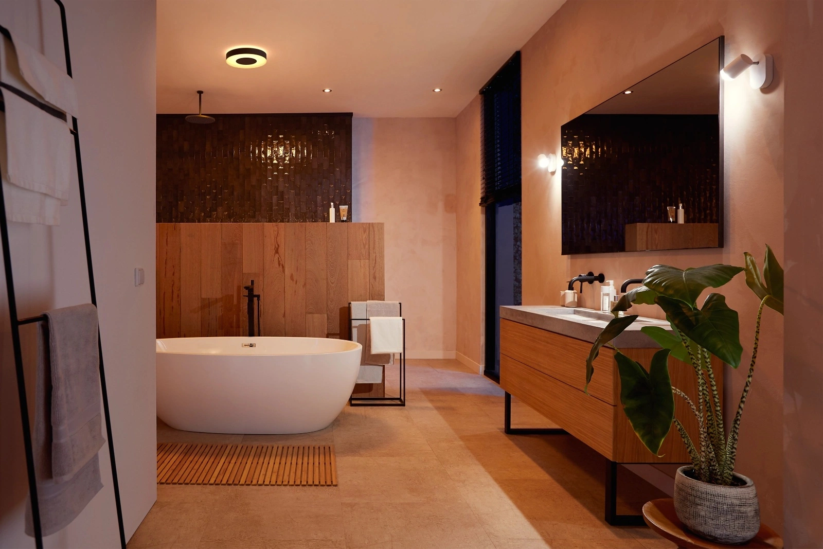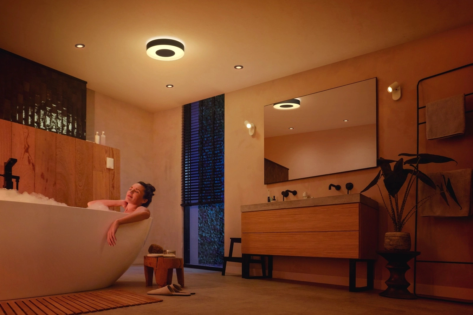 Odmień swoje wnętrze dzięki milionom barw światła, które pozwalają dopasować nastrój do każdej chwili. Jednym dotknięciem możesz wypełnić łazienkę delikatnym, relaksującym różem podczas kąpieli lub rozświetlić ją energetycznym fioletem, tworząc klimat idealny na spotkanie z przyjaciółmi. Z Philips Hue każda chwila nabiera wyjątkowego koloru.