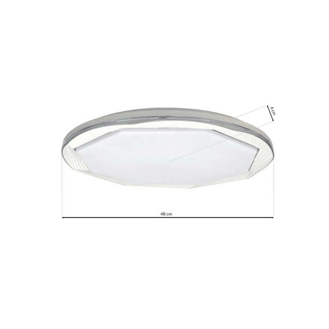 Średnica plafonu jest równa 480 mm, a jego wysokość ma 60 mm, co pozwala na montaż w dowolnie wybranym przez siebie miejscu. Plafon to oświetlenie dopracowane w najmniejszych detalach. Wykonano je z wysokiej jakości tworzywa sztucznego oraz metalu. Te materiały są wyjątkowo odporne na ścieranie i na zarysowania, dzięki czemu plafon długo zachowa swój dobry wygląd. Ten model opisano za pomocą stopnia ochrony IP20. Jest zatem odporny na szkodliwe działanie różnego rodzaju pyłów. Moc tej lampy wynosi z kolei 52W.