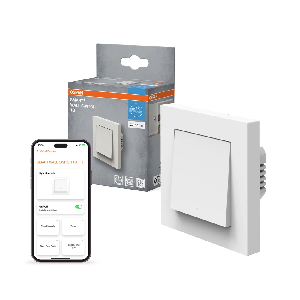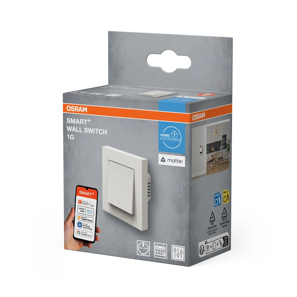Odkryj inteligentne sterowanie swoim domem dzięki Przełącznikowi Włącznikowi Ścianemu Inteligentnemu Osram SMART+ WiFi Matter. Ten elegancki, czarny przełącznik doskonale integruje się z technologią Matter, oferując łatwe sterowanie za pomocą aplikacji SMART+, która jest dostępna na urządzenia z systemem Android od wersji 8.0 i iOS od wersji 14.0. Z jego pomocą możesz komfortowo sterować konwencjonalnymi źródłami światła i innymi urządzeniami elektrycznymi, bez potrzeby sięgania po pilot czy podchodzenia do włącznika. Zastosowanie protokołu Matter over WiFi (2,4 GHz) umożliwia bezproblemowe połączenie i kontrolę poprzez najpopularniejsze platformy jak Amazon Alexa, Google Home, Apple Home oraz Samsung SmartThings.