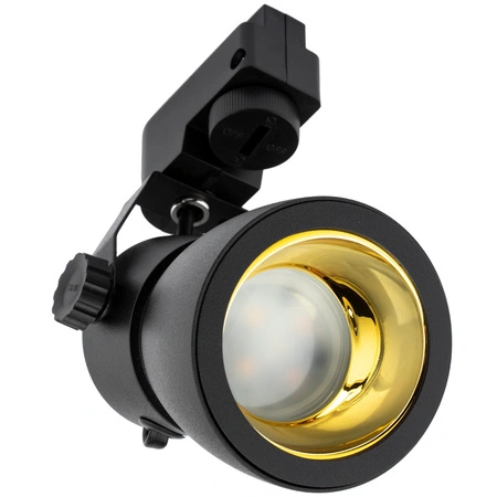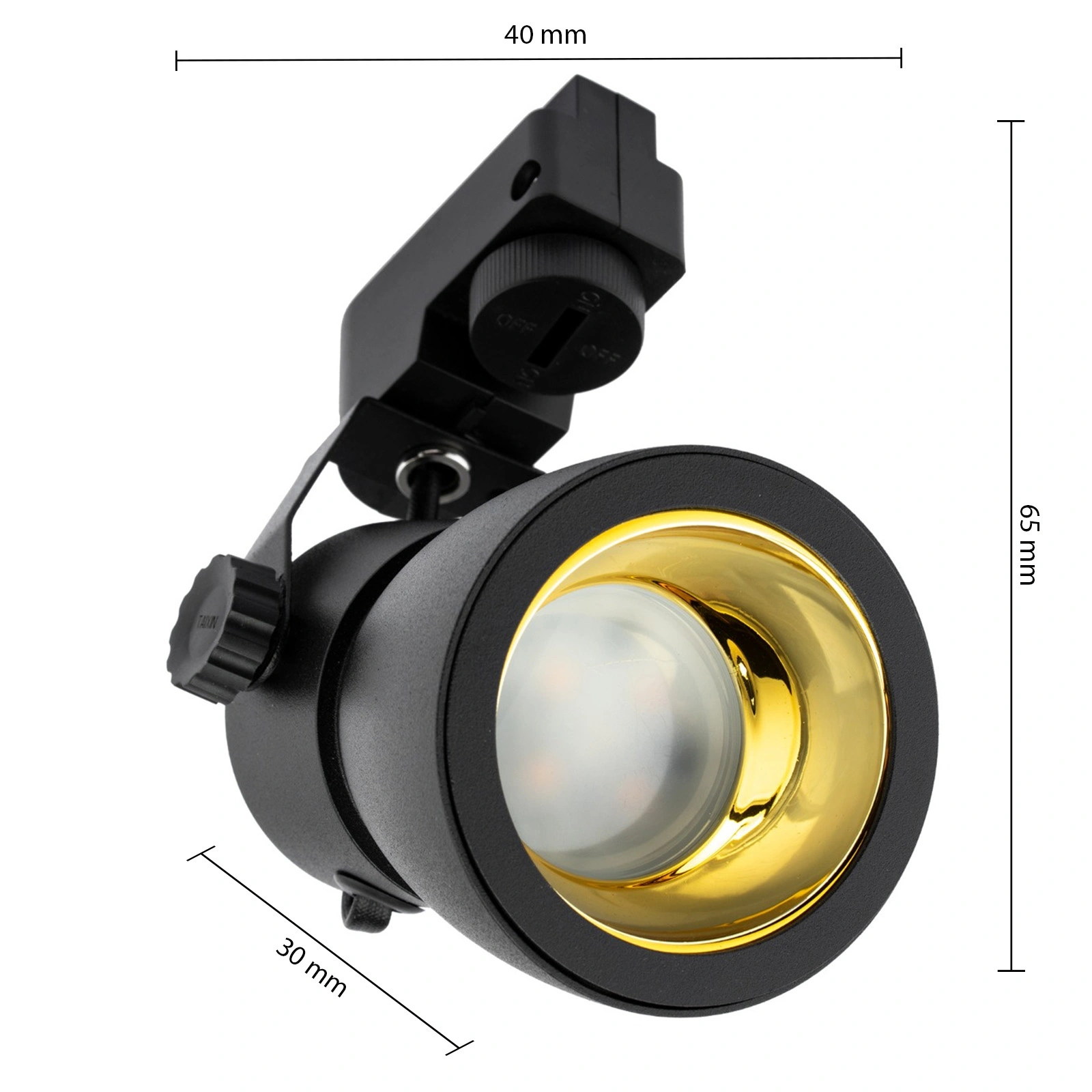 Reflektor Szynowy w kolorze czarno-złotym wykonany z wysokiej jakości stopu aluminium. Reflektor, Lampa przeznaczona do montażu szynowego, z Możliwością zamontowania dowolnej Żarówki z gwintem GU10 o maksymalnej mocy nieprzekraczającej 35W. Lampa działa na szynoprzewodach jednofazowych. Dzięki zastosowaniu szyn możemy sterować oświetleniem w pomieszczeniu w zależności od aktualnych predyspozycji.