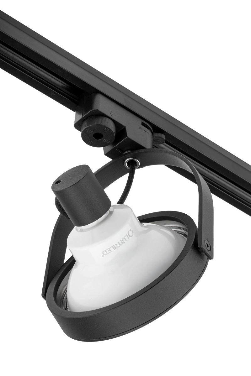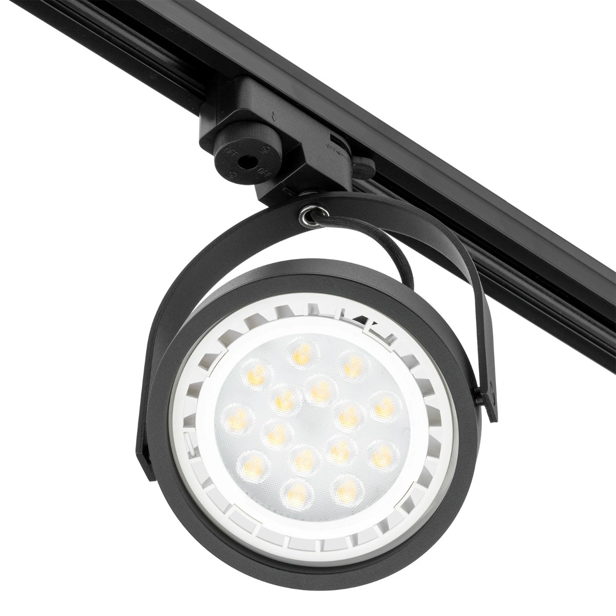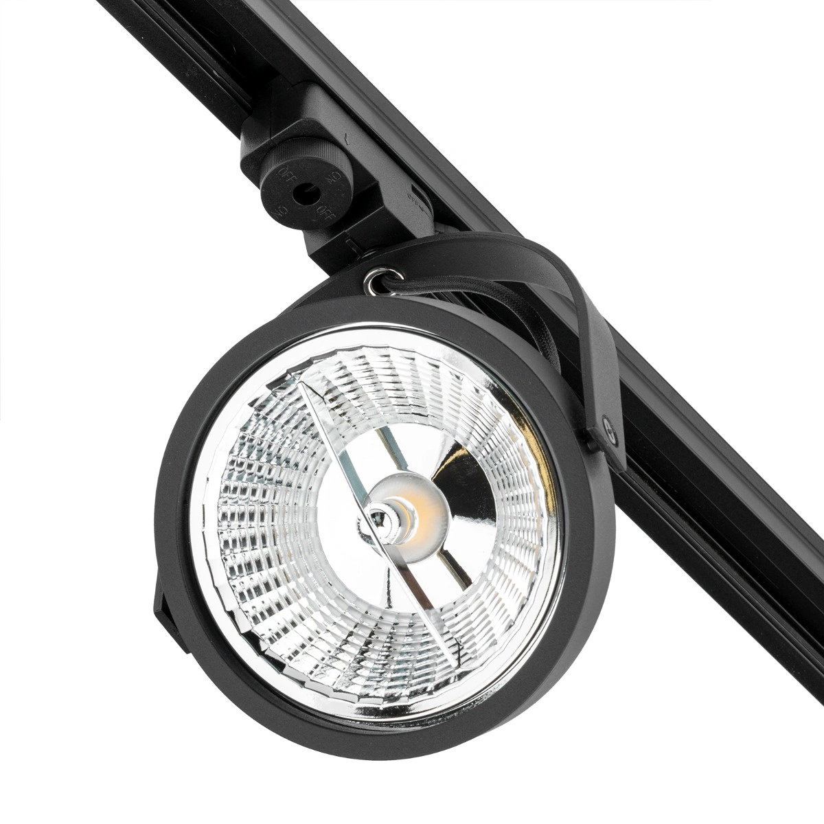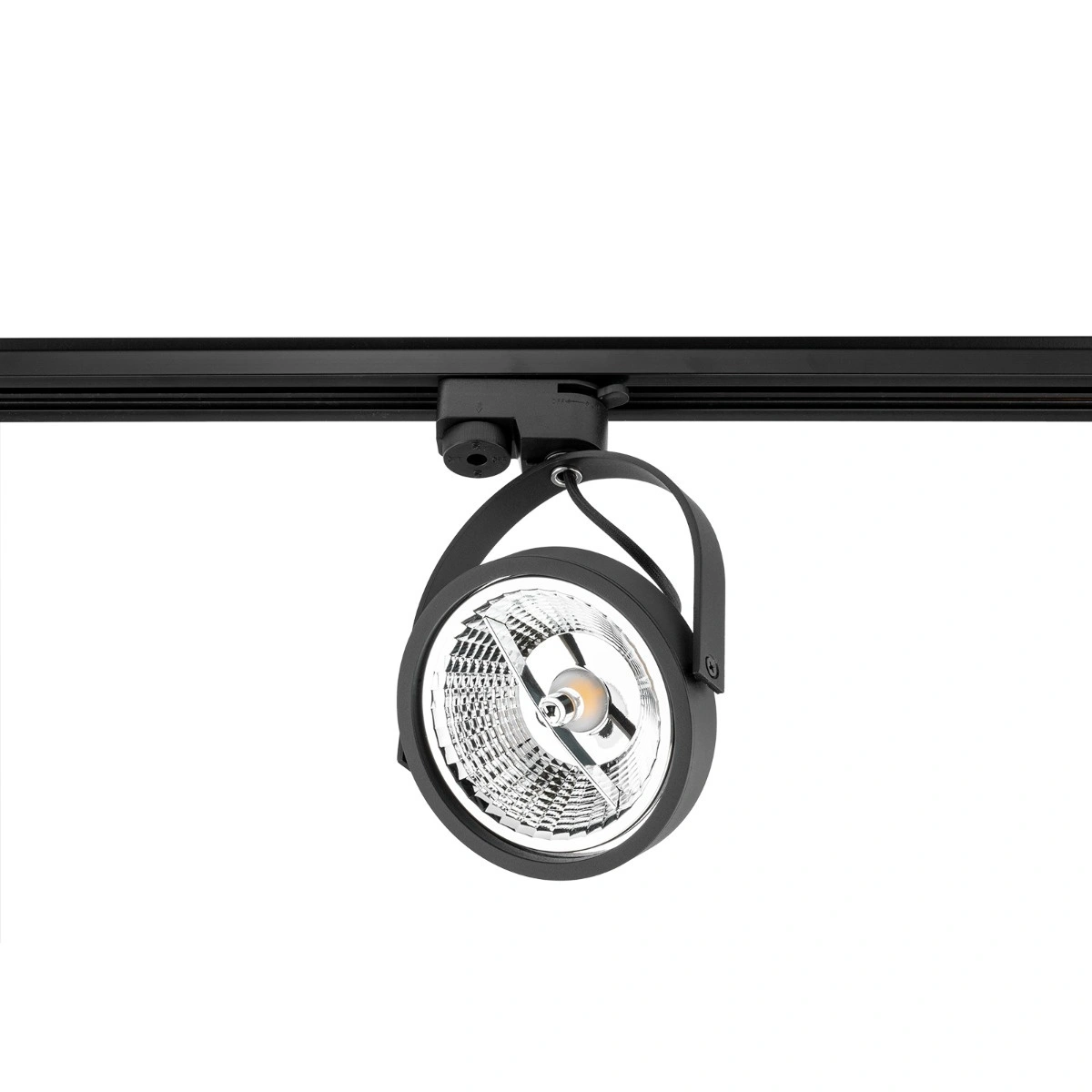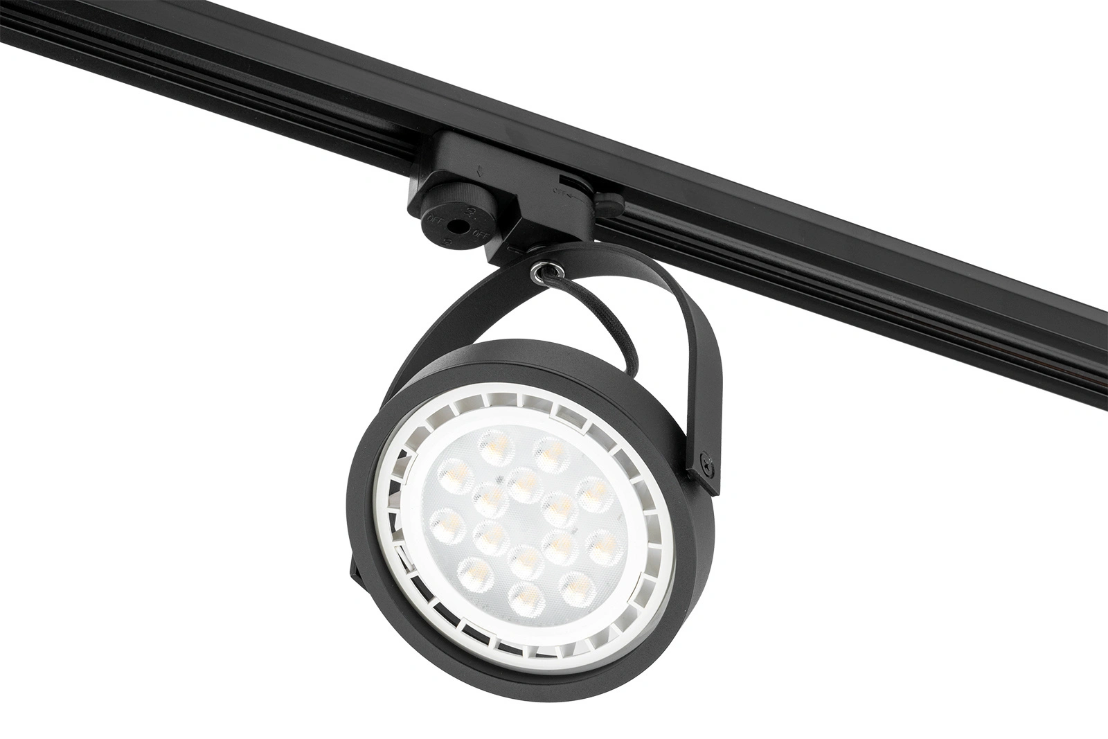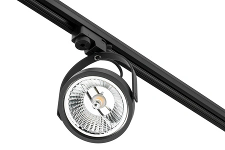 Reflektor szynowy koloru czarnego na wymienne źródło światła o trzonku GU10. Lampa wraz z żarówką ES111 o wąskim kącie świecenia świetnie sprawdzi się do oświetlenia takich miejsc jak gabinet, korytarz, witryna.