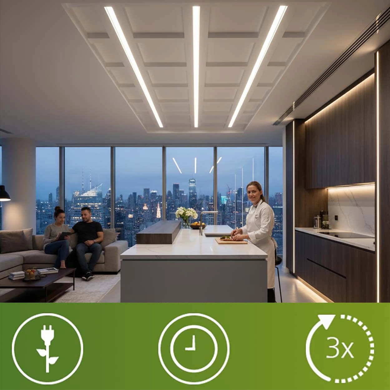 Nowoczesne źródło światła LED to nawet 70% mniejsze zużycie energii, co przekłada się na niższe rachunki za prąd i większą dbałość o środowisko. Dzięki żywotności aż 50 000 godzin zapominasz o częstej wymianie świetlówek, a to oznacza wygodę i oszczędność czasu. Trzykrotnie dłuższa trwałość w porównaniu do tradycyjnych źródeł światła sprawia, że inwestycja szybko się zwraca. Dodatkowo, klasa energetyczna B to gwarancja maksymalnej efektywności przy minimalnym zużyciu – idealny wybór dla Twojego portfela.
