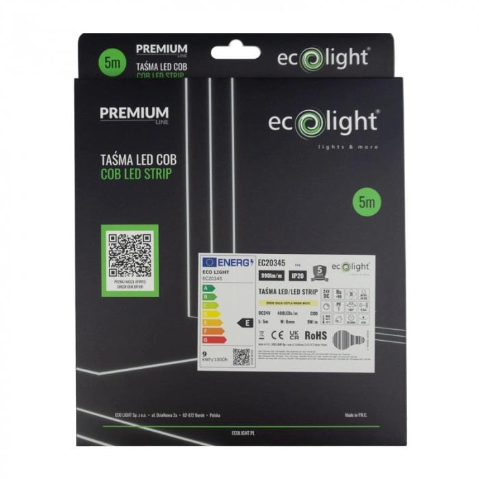 • Wydajność energetyczna: Taśma LED COB o mocy 9W/m dostarcza imponujący strumień świetlny 990lm/m, co zapewnia jasne i oszczędne oświetlenie.