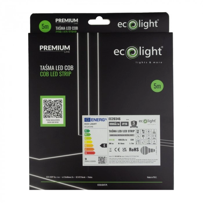 Odkryj nowy wymiar oświetlenia z taśmą LED COB od Ecolight! Ta pasmo oświetleniowe to idealne rozwiązanie do Twojego domu, które łączy w sobie nowoczesną technologię z eleganckim designem. Oferuje światło o mocy 9W na metr, co zapewnia jasne, energooszczędne i trwałe oświetlenie. Z temperaturą barwową 4000K, taśma emituje neutralne białe światło, doskonale nadające się do pomieszczeń codziennego użytku, takich jak salon, sypialnia czy jadalnia.