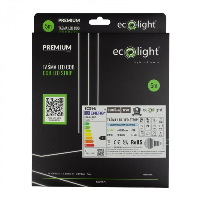 Odkryj świat nowoczesnego oświetlenia z taśmą LED COB od Ecolight! Ten innowacyjny produkt, o mocy 9W na metr, zapewnia wyjątkowo jasne i energooszczędne światło o zimnej barwie 6000K, dzięki czemu idealnie nadaje się do wnętrz takich jak salon, sypialnia czy korytarz. Taśma oferuje niesamowitą ilość 480 diod LED na metr, co gwarantuje równomierne rozpraszanie światła i tworzenie przytulnej atmosfery w Twoim domu.