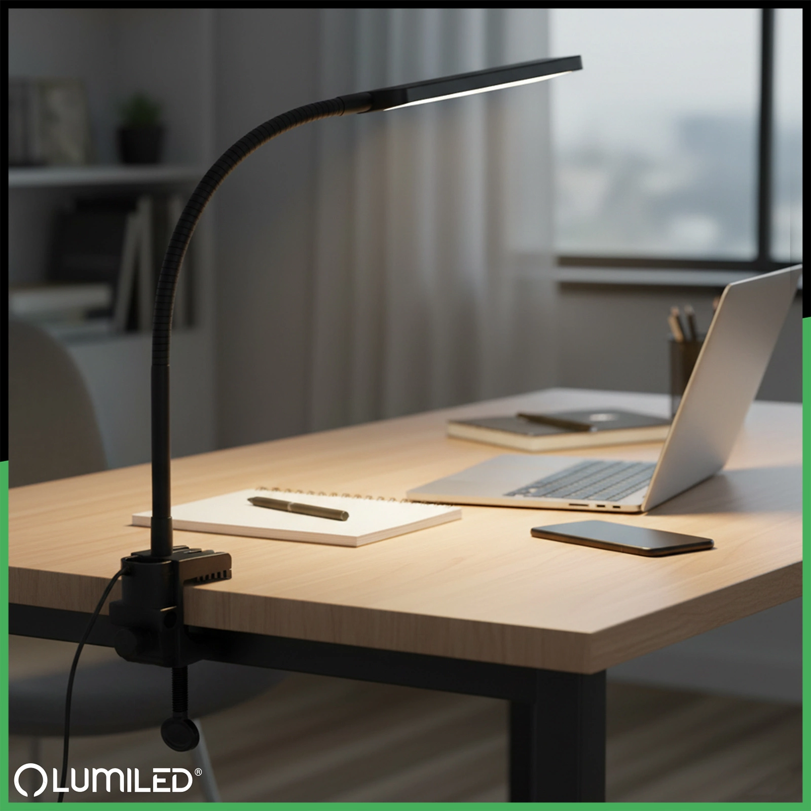 Elegancki czarny kolor uchwytu nadaje mu uniwersalny charakter, dzięki czemu świetnie komponuje się z każdym rodzajem biurka – od klasycznych drewnianych blatów po nowoczesne powierzchnie w jasnych odcieniach. Matowe wykończenie dodaje całości profesjonalnego wyglądu i sprawia, że uchwyt pozostaje dyskretny, nie odciągając uwagi od samej lampki. To rozwiązanie, które łączy estetykę z praktycznością, pasując zarówno do domowych wnętrz, jak i biurowych aranżacji.